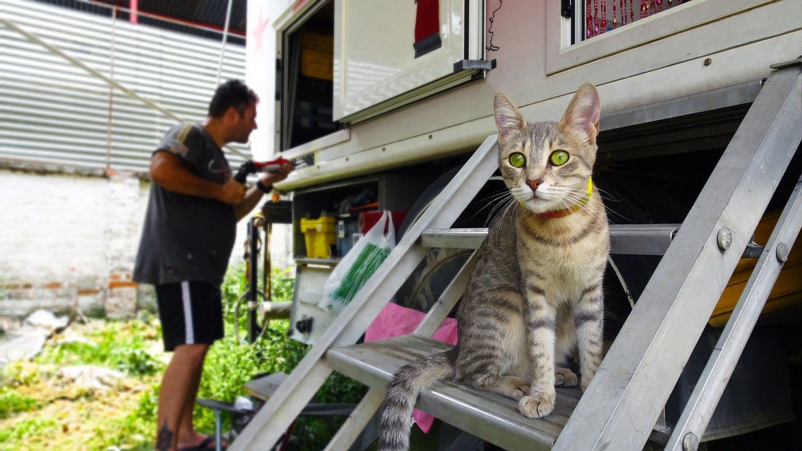 Rarement heureusement, elle fugue, nous laissant des heures durant à crier son nom, en vain. A ses heures, il lui prend aussi de démonter le camion, abîmant moustiquaires et joints de porte, salissant les coussins et taies, nous donnant de quoi nous occuper davantage.