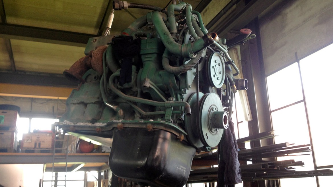 Transporté, décrassé, nettoyé, chouchouté et repeint, faites connaissance avec la pièce maîtresse : 2.00 m de dispositifs mécaniques pour un moteur de près de 900 kg. Un bon gros bébé tout réparé et tout reluisant !