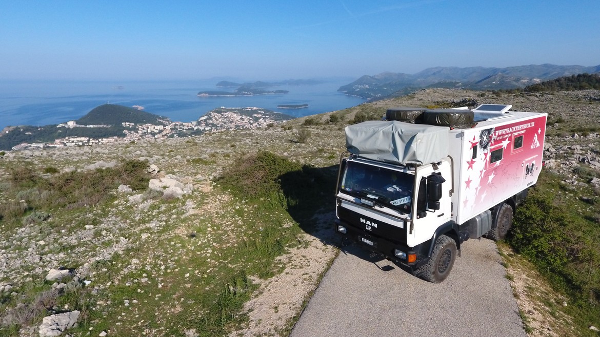 Dubrovnik est probablement la ville la plus visitée de Croatie et sûrement aussi la plus chère. Se parquer ici à un prix raisonnable tient du miracle. Heureusement, Mike, qui a plus d’un tour dans son sac, propose de monter en camion jusqu’au sommet du téléphérique qui surplombe la ville et les îles alentour. La route d’accès y est si compliquée que peu de gens s’y aventurent. A part les quelques courageux touristes, bus navettes et taxis locaux, il fallait bien un brave chauffeur valaisan et fier de ses origines alpines pour monter là-haut avec son camion sous le regard ahuri ou admiratif des autres usagers de ladite route. Là-haut sur la montagne l’était un bel Antares et l’était tellement bien que l’était trois jours durant, avec un panorama à couper le souffle et ce, pour pas un rond