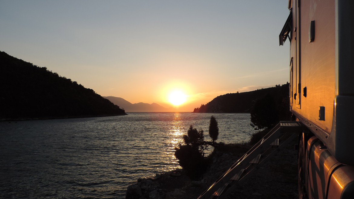 Nous repérons un premier emplacement, idéal, dans une baie à l’abri du vent, où on nous rappelle gentiment que le camping sauvage n’est pas admis. Un peu déçus, nous parcourons encore quelques kilomètres avant de bifurquer sur un sentier rocailleux, et de toute évidence, non entretenu. 4x4 et vitesses courtes enclenchées, Antares se fraie tant bien que mal un chemin au milieu des branches. Nous arrivons sur un parking un peu morbide au milieu de plusieurs caravanes laissées à l’abandon mais pour la bonne surprise, une baie orientée plein sud s’ouvre devant nous et nous offre un superbe coucher de soleil, Antares a presque les pneus dans l’eau et ici, personne ne viendra nous déloger pour la nuit.