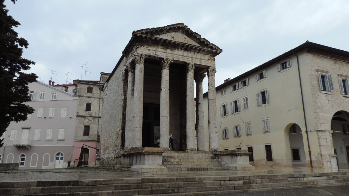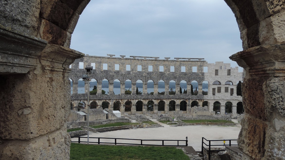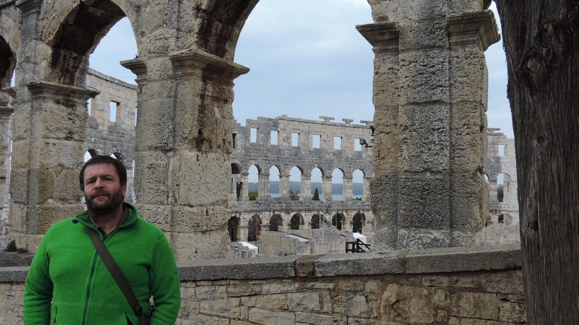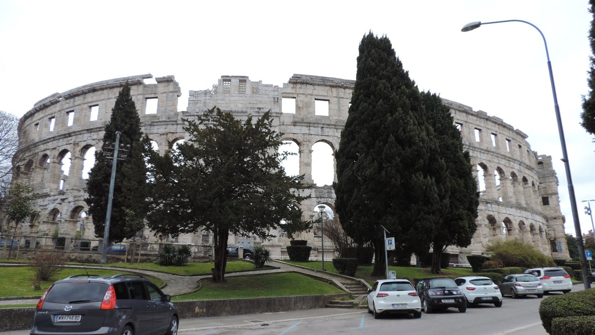 Les premiers campings à la pointe de l'Istrie ouvrent leurs portes aujourd'hui. Nous allons passer la nuit au camping de l'Arena Stupice à Premantura, un site privilégié des kitesurfeurs. Sur notre route, nous nous arrêtons à Pula pour visiter l'amphithéâtre et déguster quelques spécialités locales : Pljeskavica (version balkanique du hamburger) pour Mike et Ražnjići (brochettes de porc grillées) pour Carole.