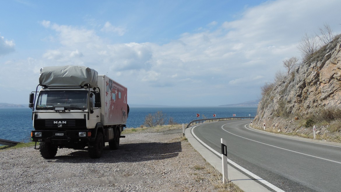 Nous reprenons ensuite notre route en longeant la côte croate. La météo changeante nous donne tour à tour de la pluie, du vent et du soleil. Nous profitons de quelques rayons pour faire halte en bord de mer et casser la croûte avant de reprendre de la hauteur et de retourner dans les terres.