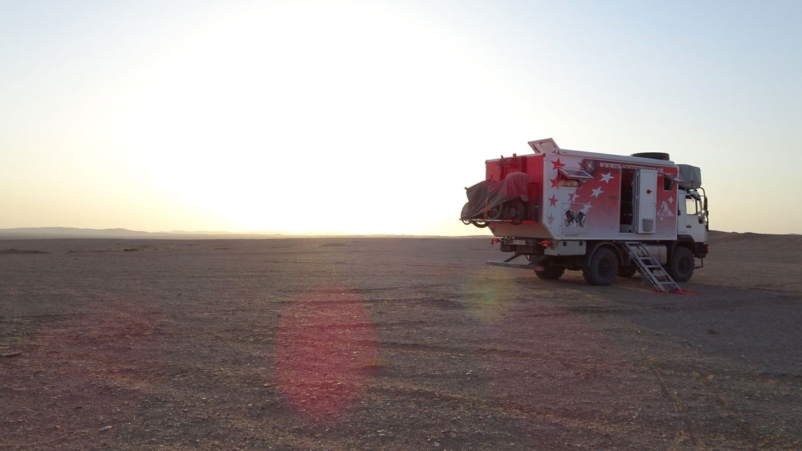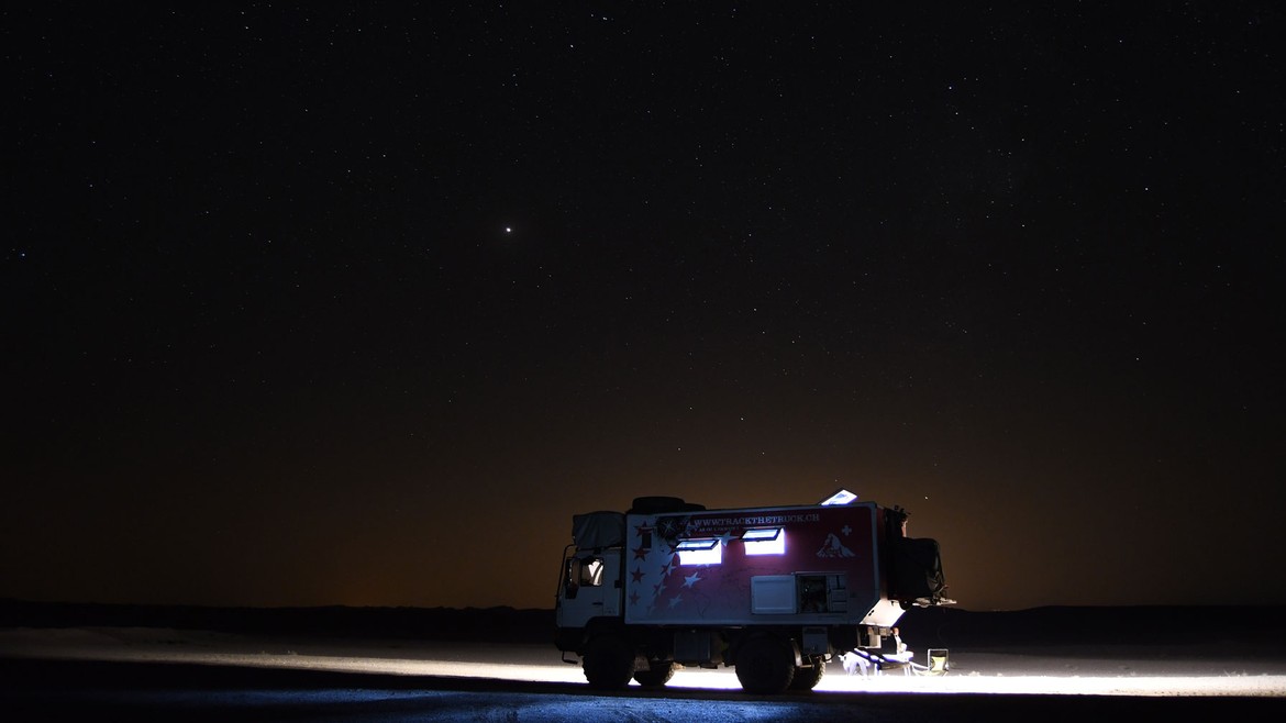Nous installons Antares à 200 mètres de là. Les températures chutent rapidement, nous offrant une soirée agréable. Il n’y a pas de mots pour exprimer la beauté du ciel dans le désert... Il n’y a que peu d’endroits qui offrent une vue sur les étoiles avec autant de clarté. C’est magnifique ! Nous partageons un rösti avec Sébastien avant une nuit fraîche et méritée. Quel régal !