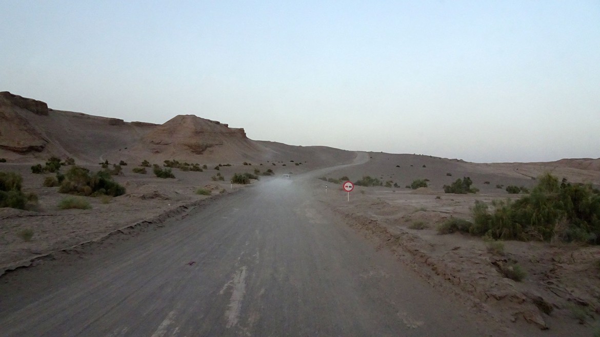 En fin de journée, nous traversons la ville de Kashan, puis celle d’Aran o Bidgol et arrivons devant un poste de contrôle à l’entrée du désert. Il faut s’acquitter d’un montant de 4’000’000 rials et se coltiner un guide. Autant vous dire que le jeu des négociations commence et que Mike ne se laisse pas marcher sur les pieds. Après une heure de débats, Sébastien, un motard français arrive, avec l’intention lui aussi de passer la nuit dans le désert. Il nous faut batailler ferme mais après deux heures de lutte acharnée, Mike arrive finalement à négocier un montant de 3’000’000 rials pour notre trio, guide inclus.