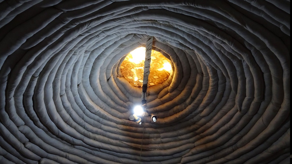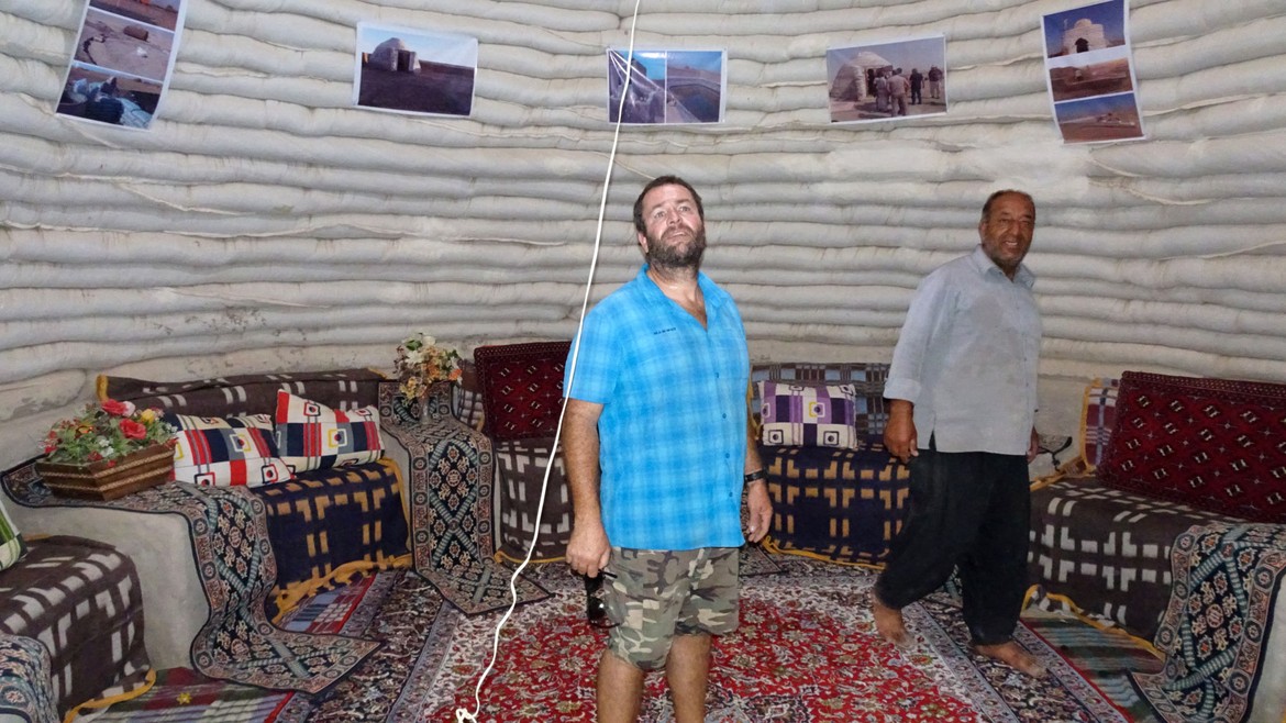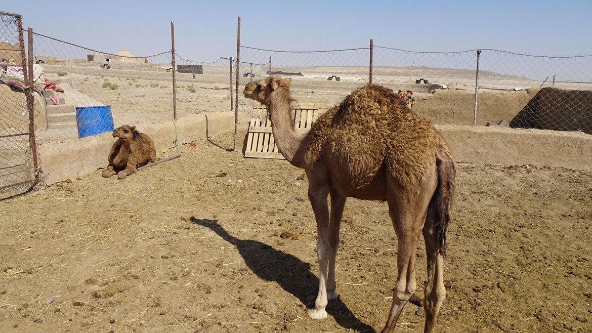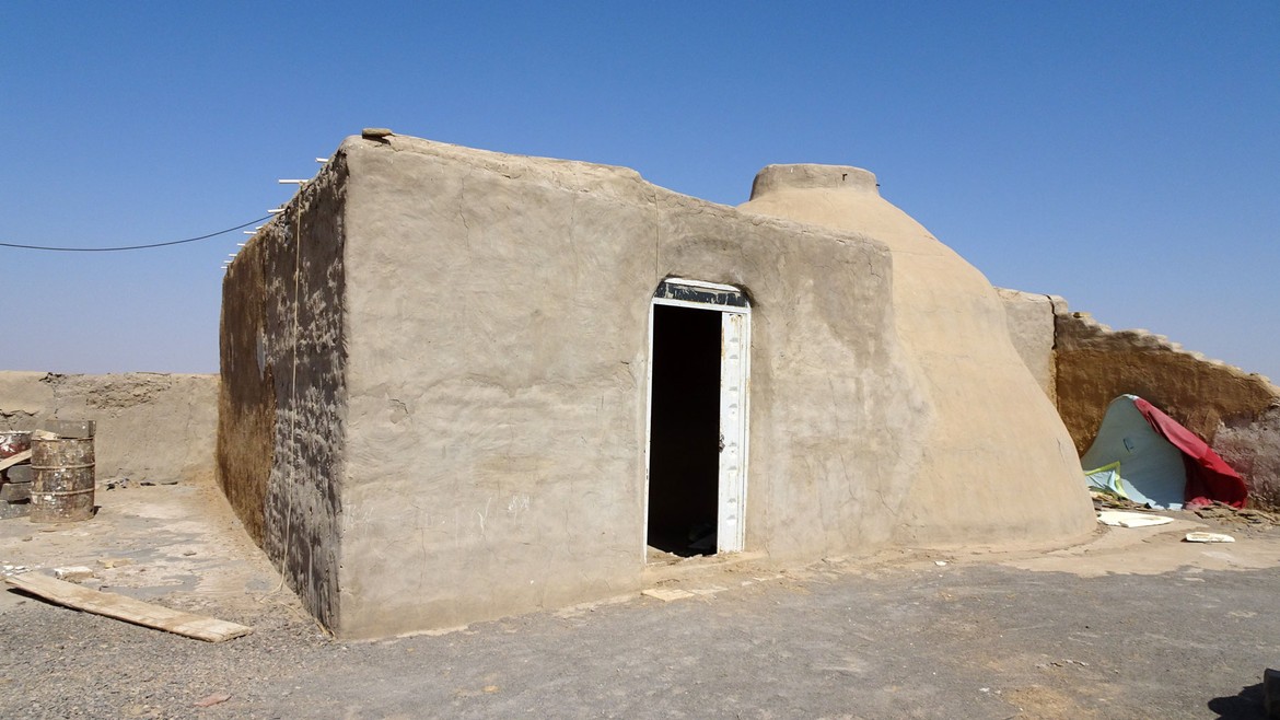 Sur le chemin du retour, nous faisons une dernière halte pour le thé, dire bonjour aux chamelons et visiter une espèce de yourte. Construit à partir de sacs de terre et ensuite recouvert d’une couche d’enduit protecteur, ce type de construction de craint ni les insectes, ni les remontées d’eau par capillarité. Il présente une bonne inertie thermique grâce à l’épaisseur de ses murs. Il fait donc frais à l’intérieur, même dans le désert.