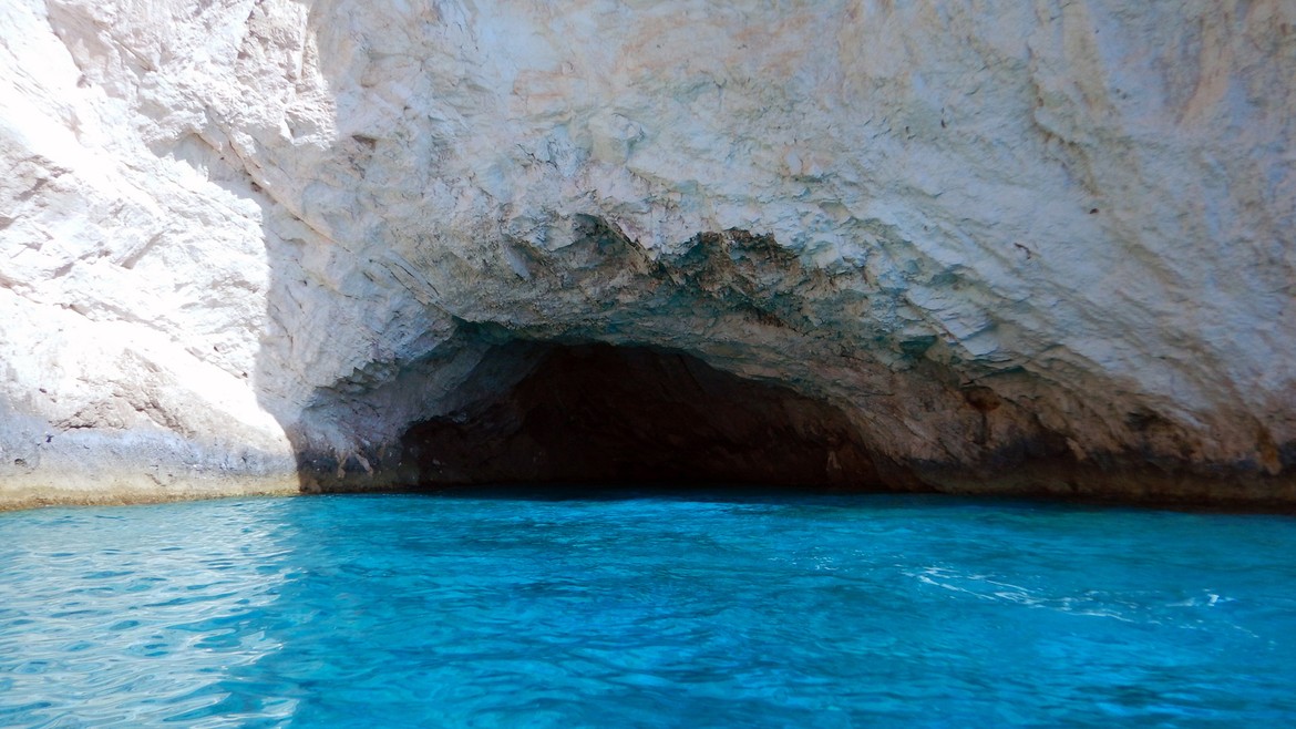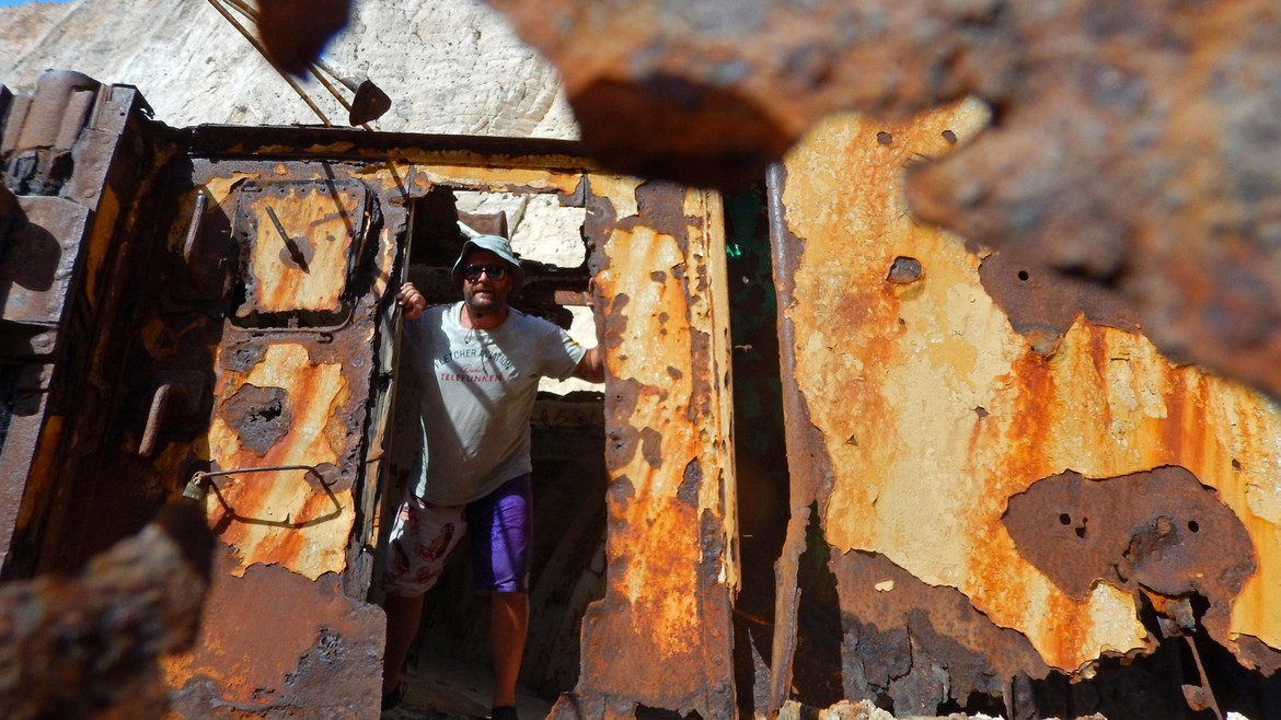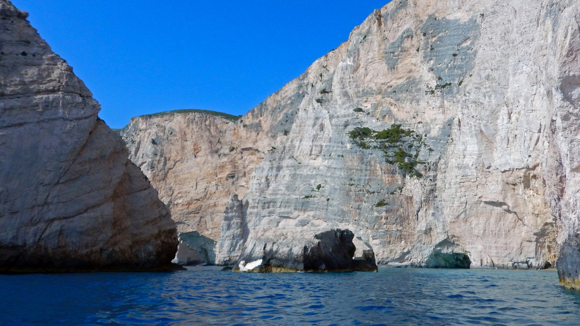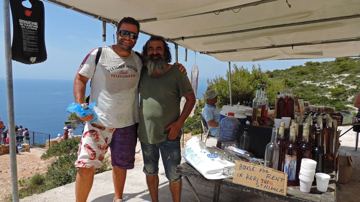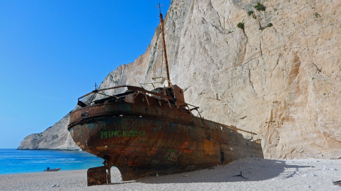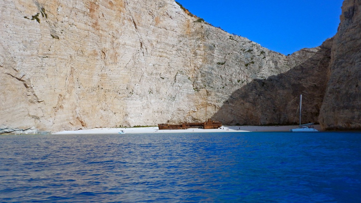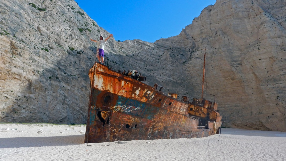 Mike découvre enfin le Panagiotis, ce navire de contrebande de cigarettes échoué sur cette crique suite à une tempête. La plage est magnifique avec son sable fin, ses falaises et son épave. On la découvre d’abord depuis le sommet des falaises, au milieu des cars de touristes asiatiques puis on s’y rend avec notre zodiac, en fin de journée, en longeant la côte et ses grottes depuis Port Vromi.