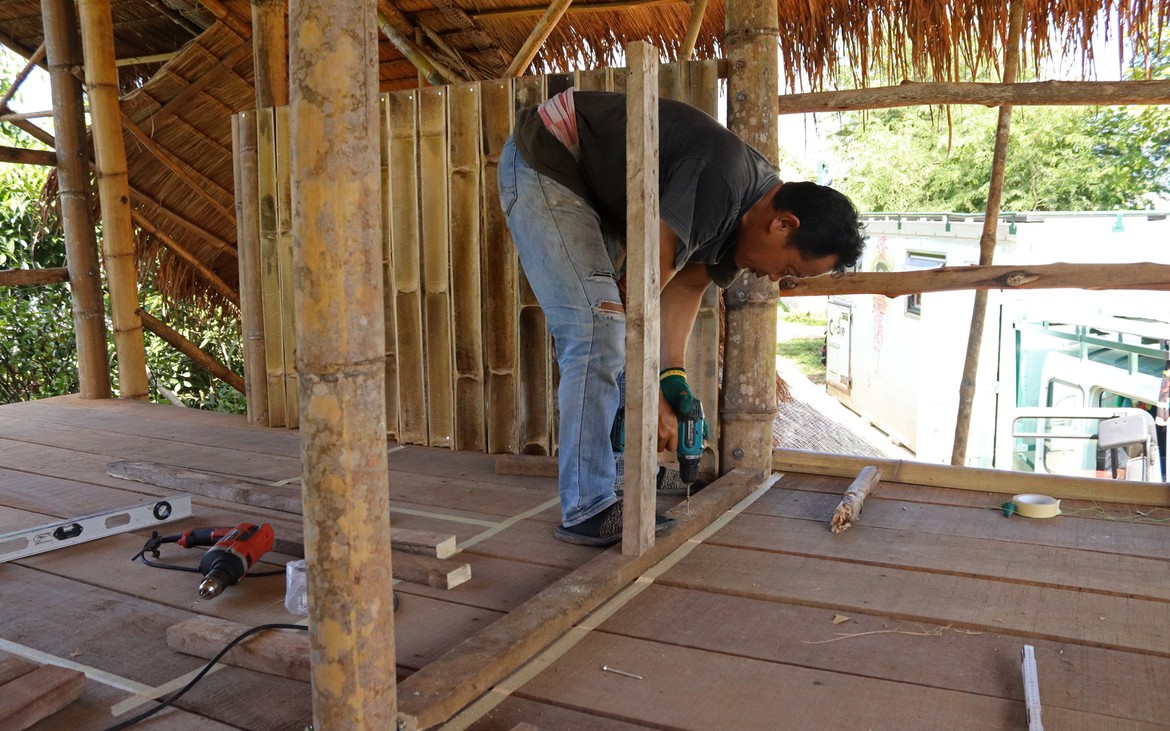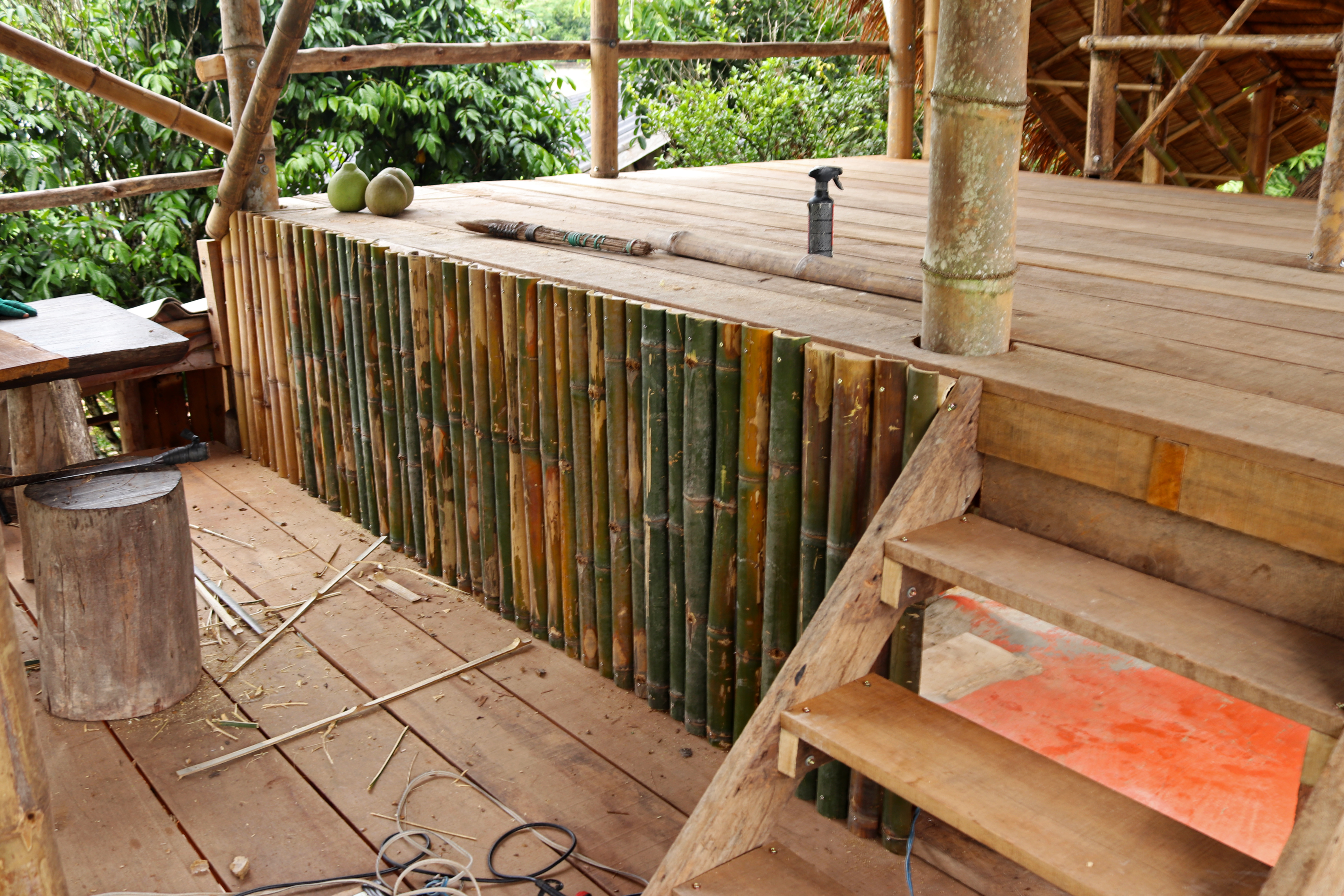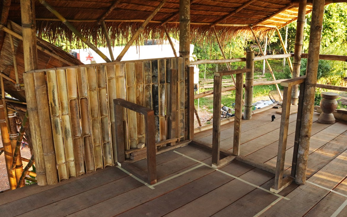 Les travaux du bar débutent aujourd'hui. Il est délimité côté entrée par une série de bambous et se compose d'une ossature en bois dont nous distinguons les premiers éléments ce soir.