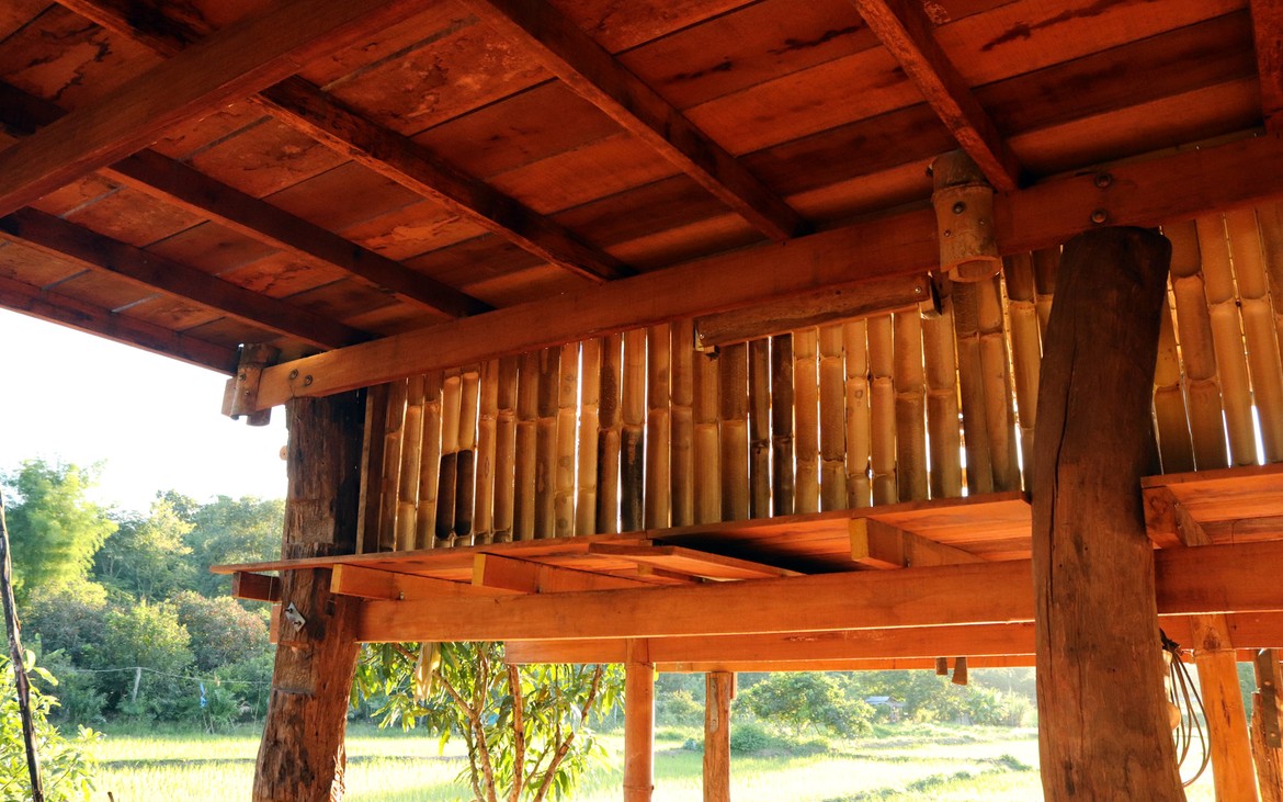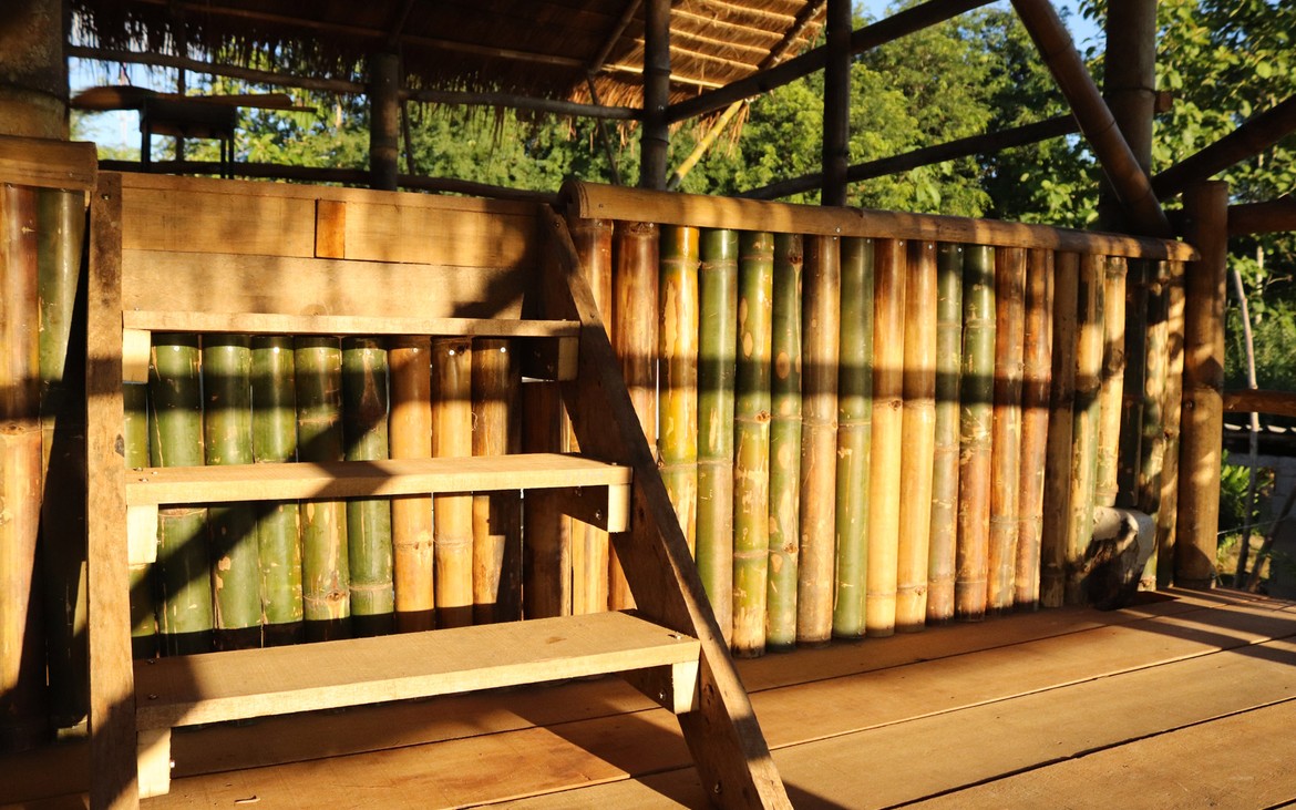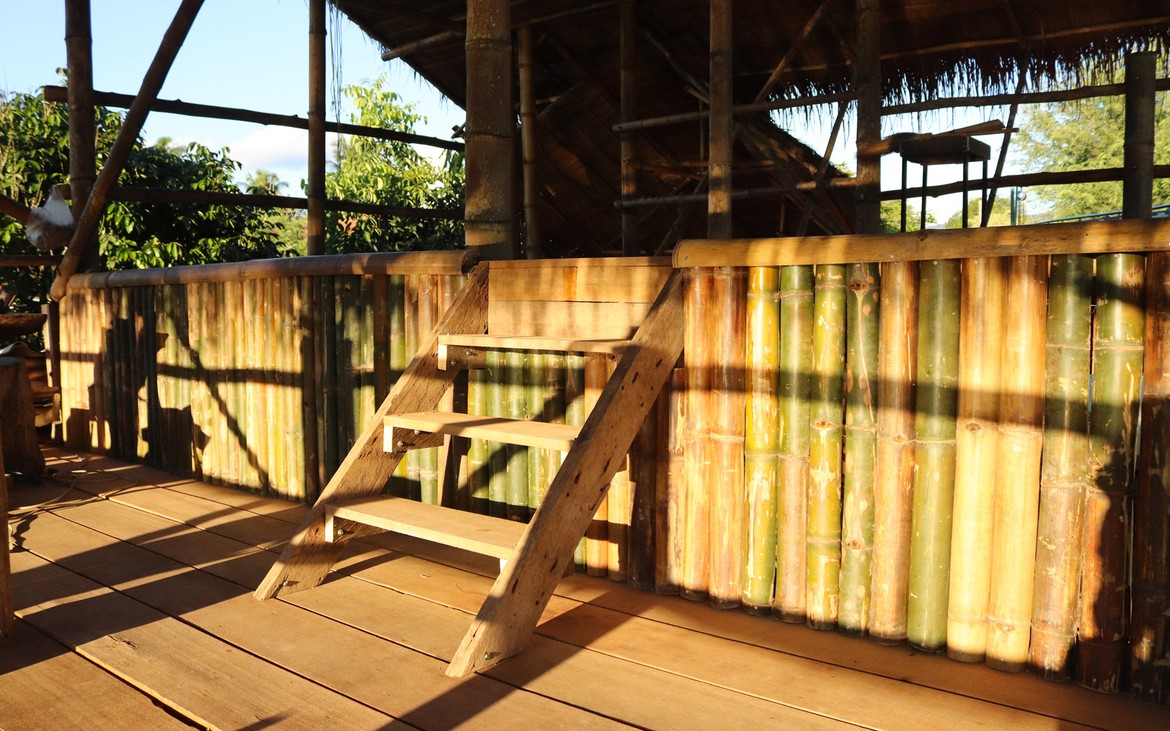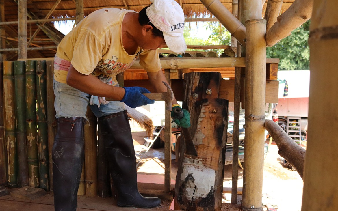 Les travaux du bar débutent aujourd'hui. Il est délimité côté entrée par une série de bambous et se compose d'une ossature en bois dont nous distinguons les premiers éléments ce soir.