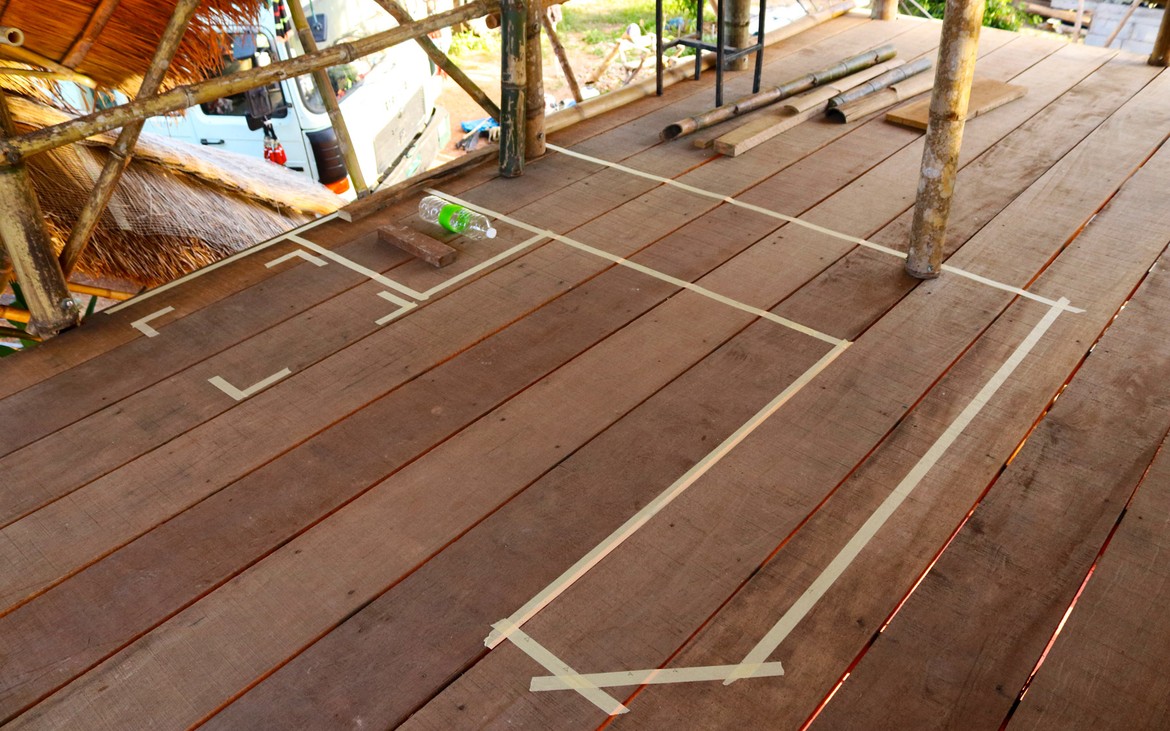 Kung est en déplacement aujourd'hui. Sans lui, et sans Mike, difficile de prendre des décisions et de progresser. Seul le marquage du bar et quelques réflexions sur sa construction occupe la journée. Nous commencerons les travaux demain.
