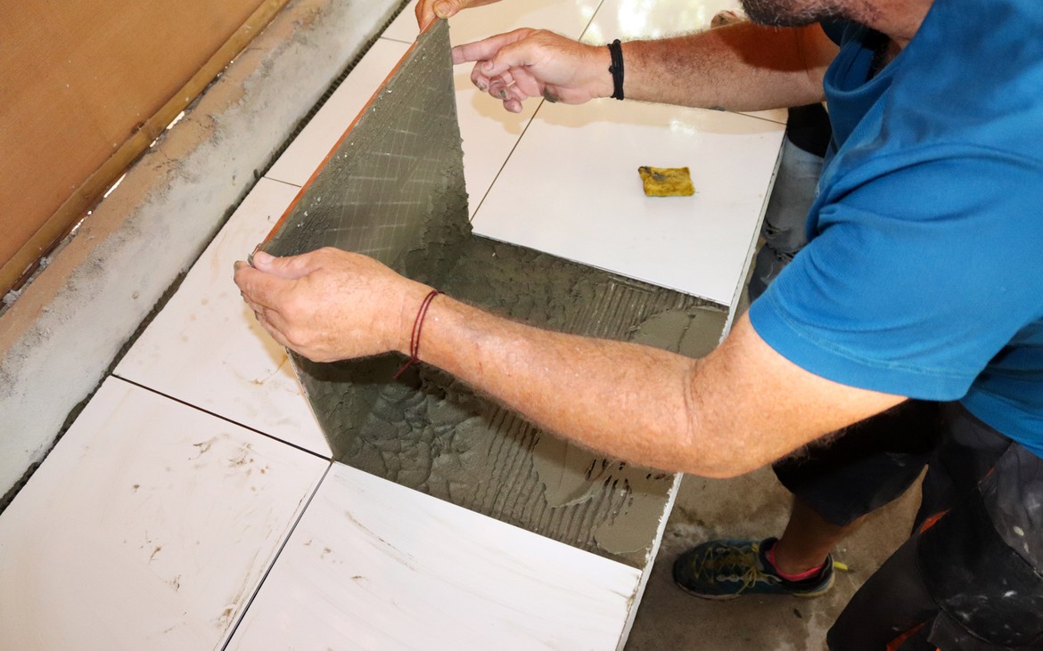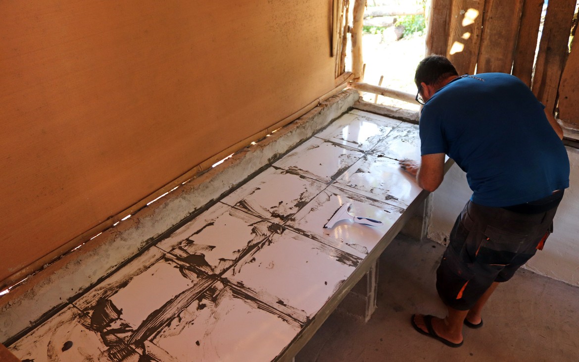 Aujourd'hui et sans attendre, il reprend du service avec la pose du carrelage sur le plan de travail de la cuisine.