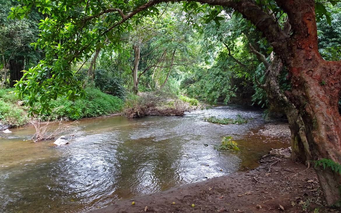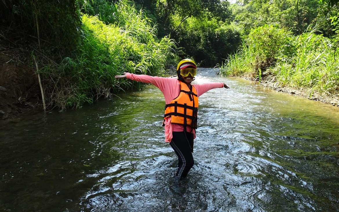 Le lit du cours d’eau est très calme, ce qui est idéal pour les débutants que nous sommes. L’eau nous arrive aux genoux et le courant est très faible, ce qui est une bonne nouvelle pour Nang qui n’est absolument pas dans son élément.