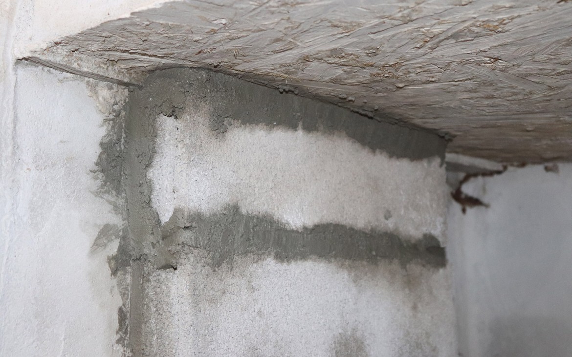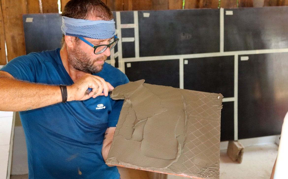 Mike termine les joints de carrelage du plan de travail et met en place les arrêts pour les gazinières.