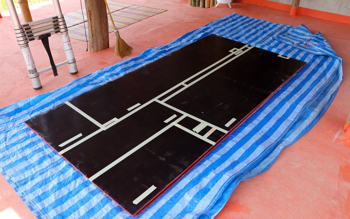 L’après-midi, nous débutons les travaux de découpe des panneaux du bar. Et pour la première fois depuis notre arrivée à Ban Thung Sai, nous apprécions la qualité d’une bonne machine qui coupe rectiligne !
