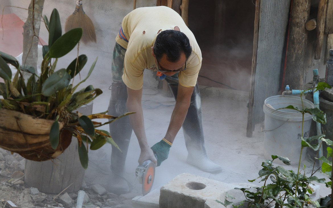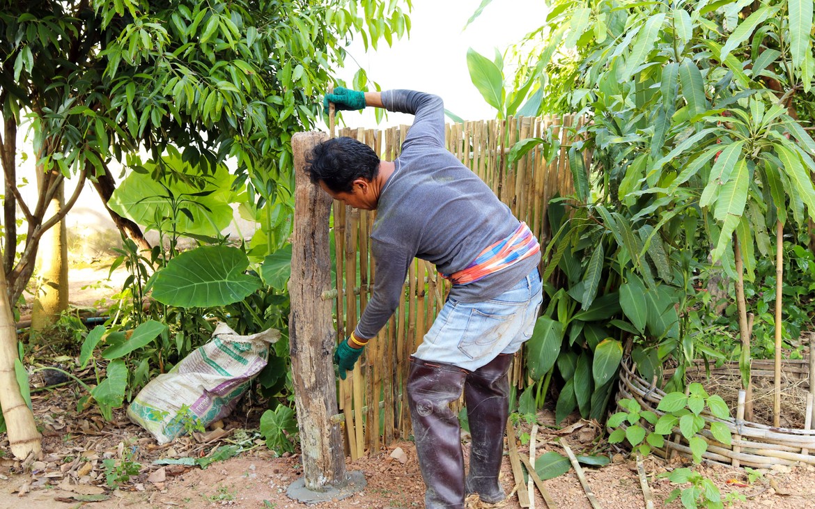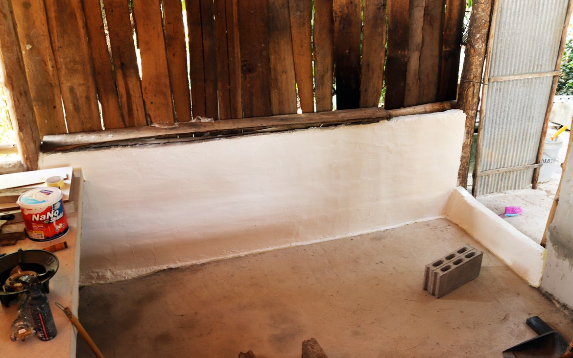 J’applique une couche de peinture sur une partie des murs de la cuisine, tandis que Kung et sa femme s'occupent des premiers éléments d'aménagements extérieurs.
