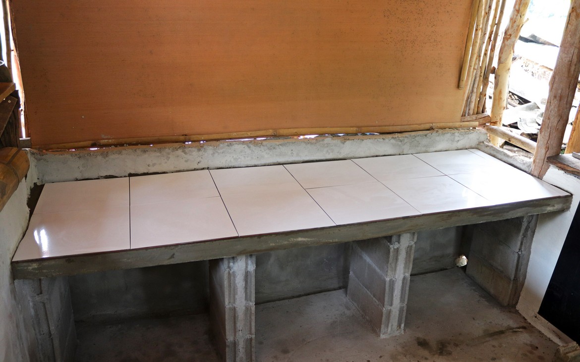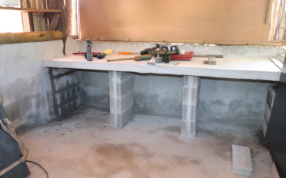 Nous procédons enfin au décoffrage du plan de travail de la cuisine. Par mesure de sécurité et afin de renforcer la stabilité du tout, nous lui confectionnons deux pieds supplémentaires.