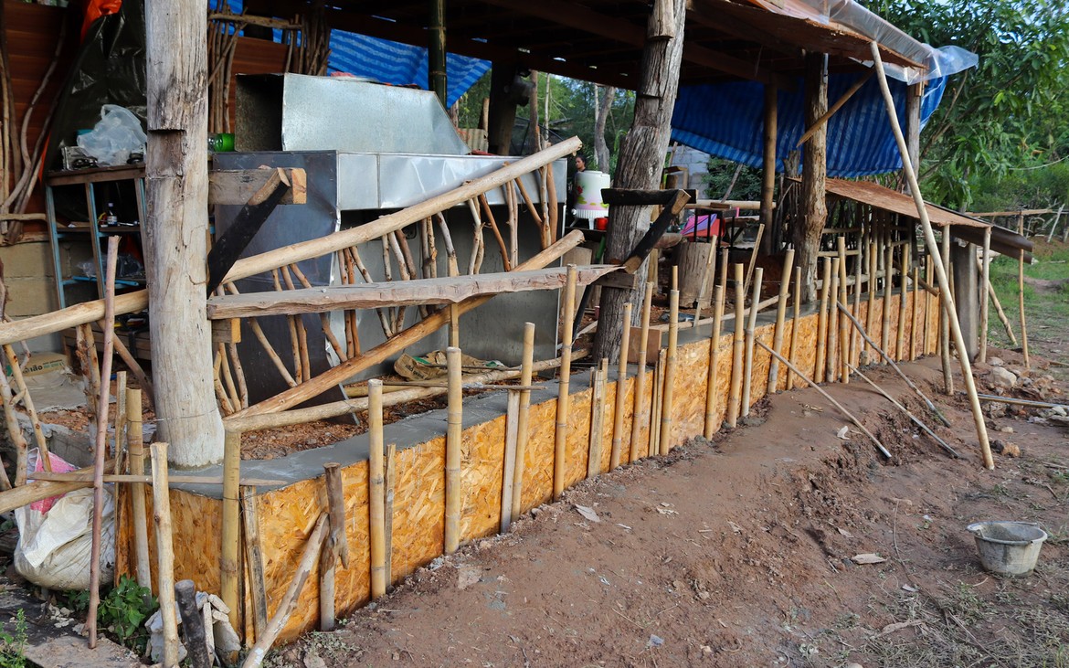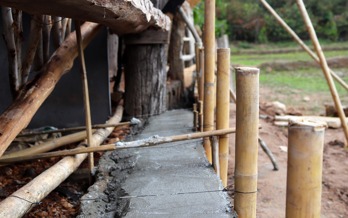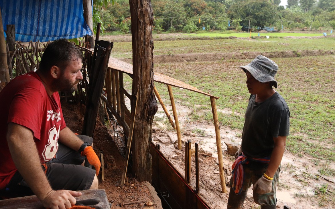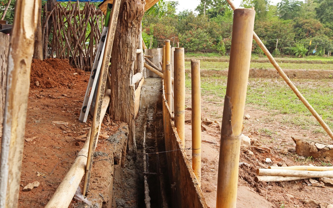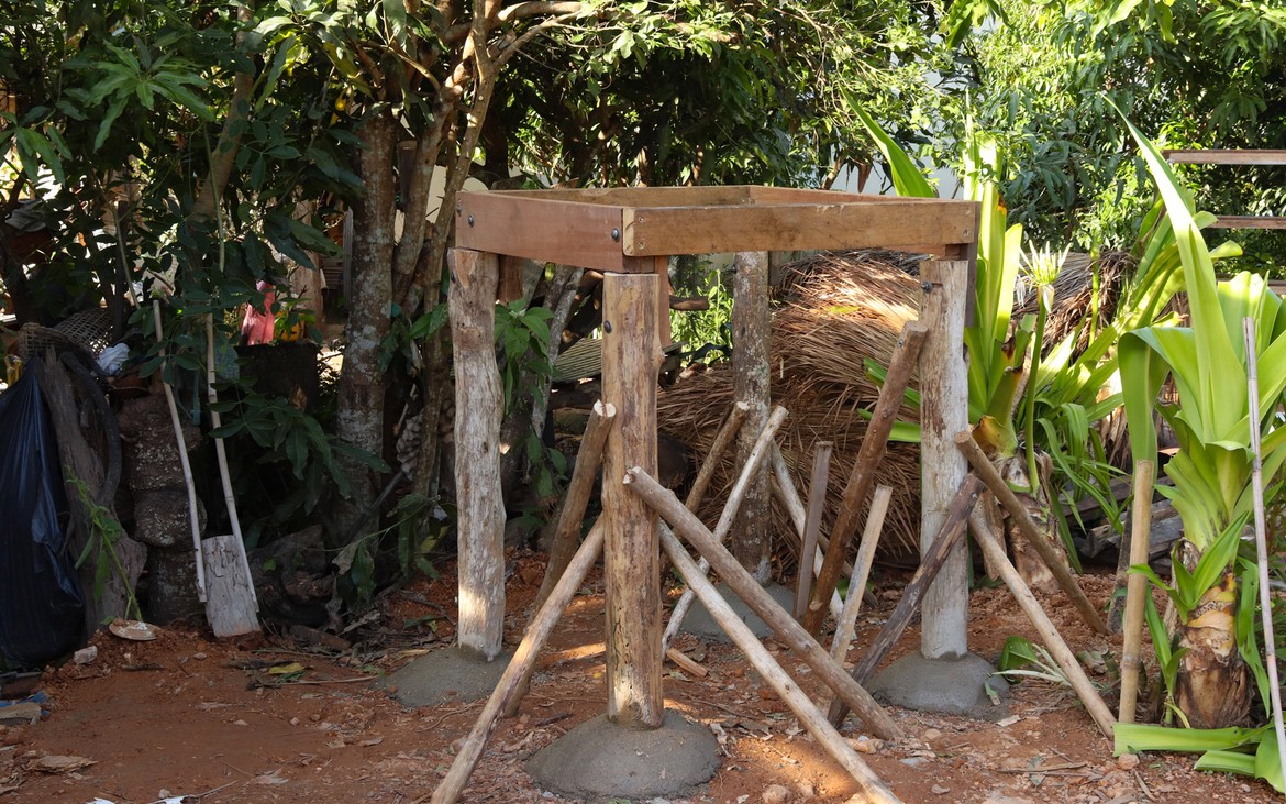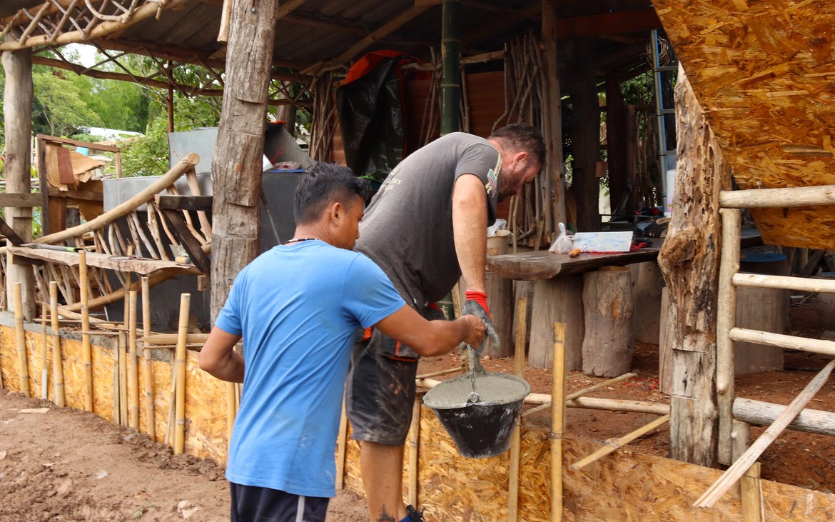 Nous avons tout de même bétonné un troisième pilier en renfort des poteaux existants ce matin. La commande de bois du second plancher ainsi que de l'escalier est passée. Ensuite et en attendant que le béton prenne, nous avons entrepris de rebâcher le premier plancher entre deux averses et de renforcer le mur de soutènement de la construction côté rizières. En effet, avec la pluie, tout le sol se dérobe... Encore une sympathique surprise à rajouter à notre longue liste !