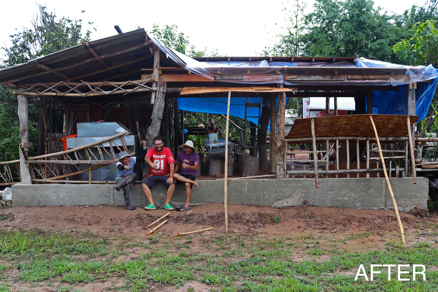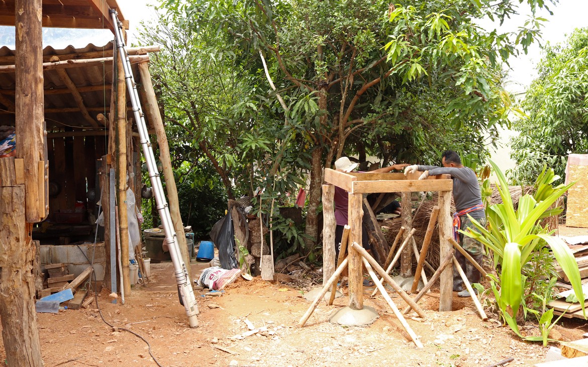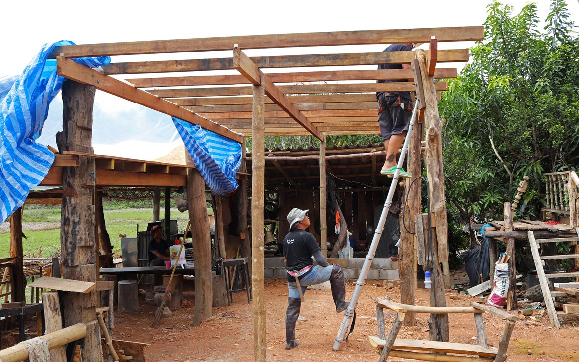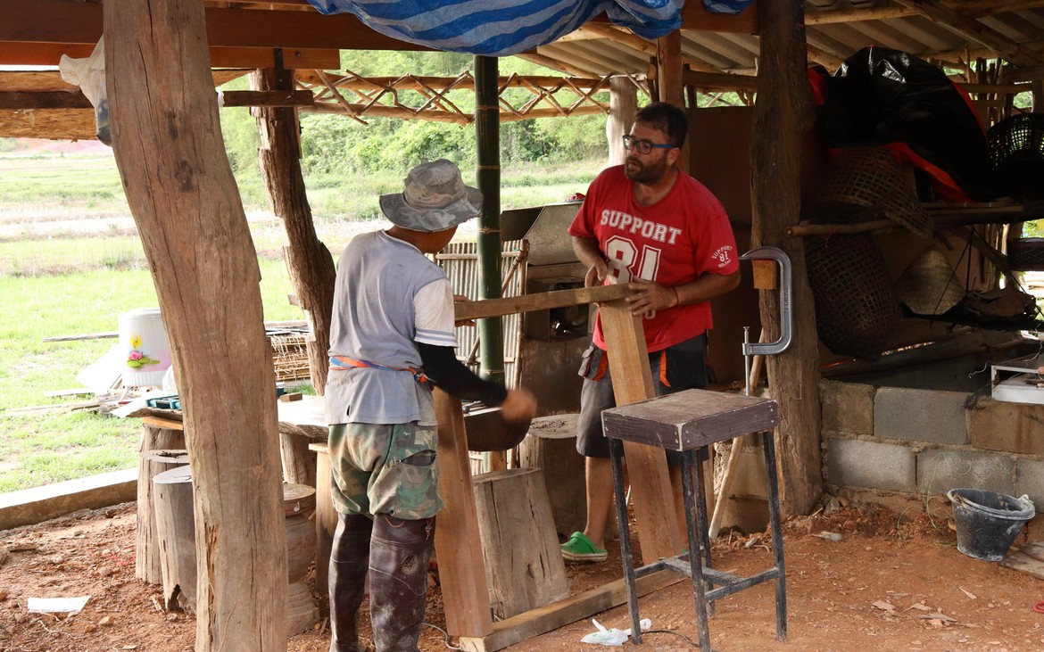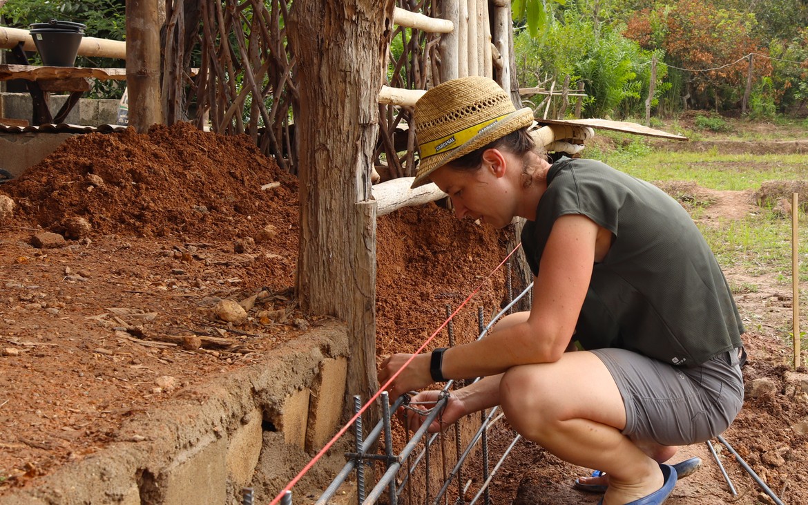 Nous avons tout de même bétonné un troisième pilier en renfort des poteaux existants ce matin. La commande de bois du second plancher ainsi que de l'escalier est passée. Ensuite et en attendant que le béton prenne, nous avons entrepris de rebâcher le premier plancher entre deux averses et de renforcer le mur de soutènement de la construction côté rizières. En effet, avec la pluie, tout le sol se dérobe... Encore une sympathique surprise à rajouter à notre longue liste !