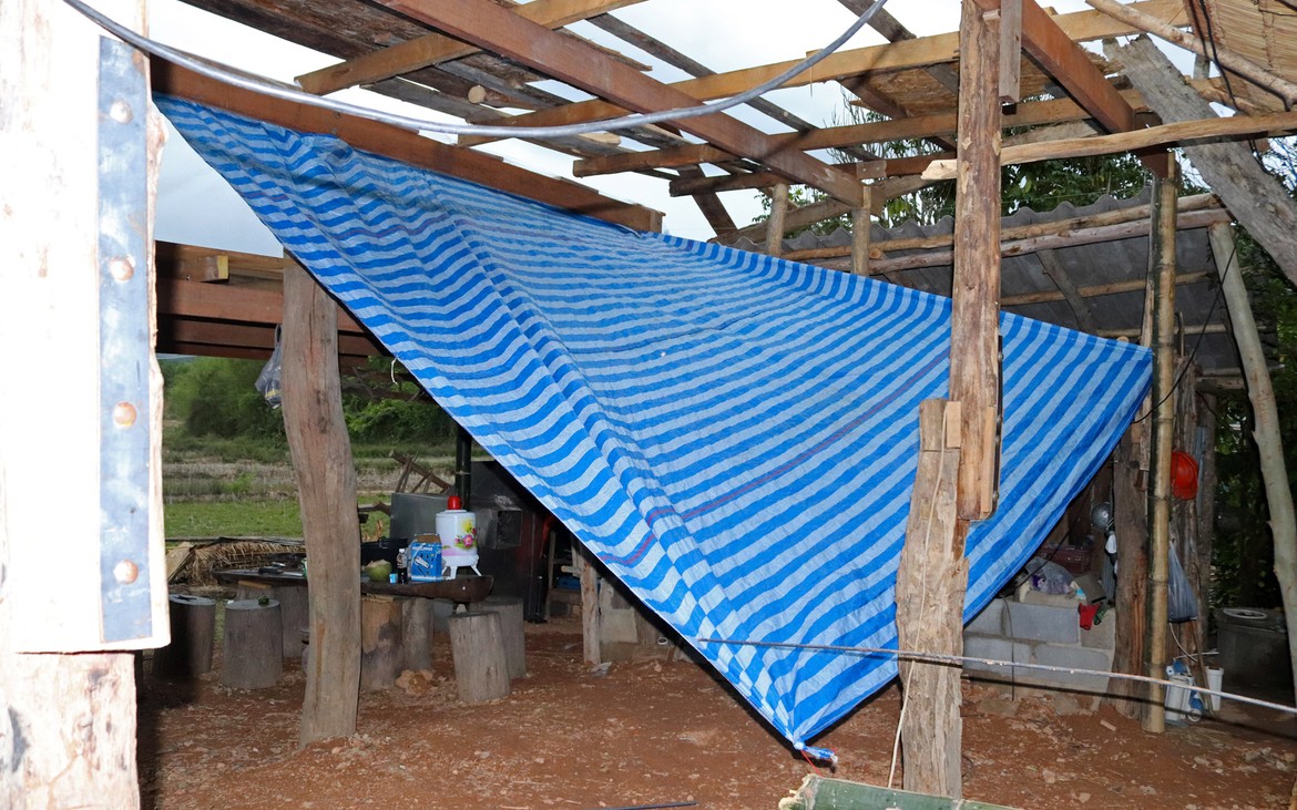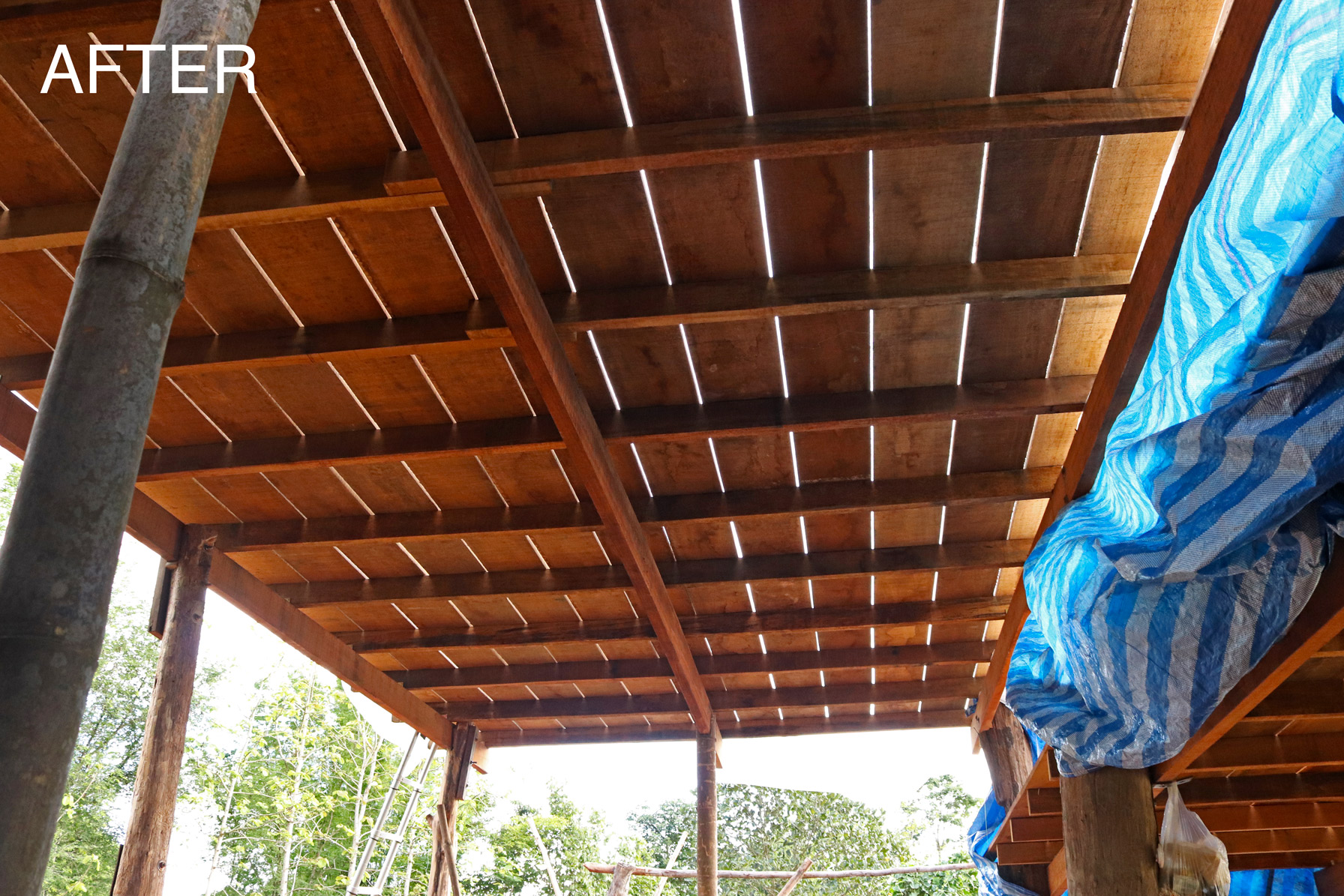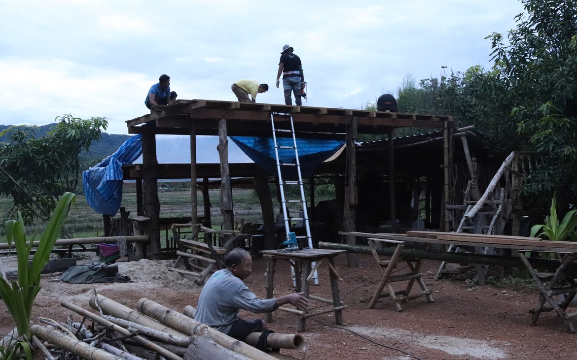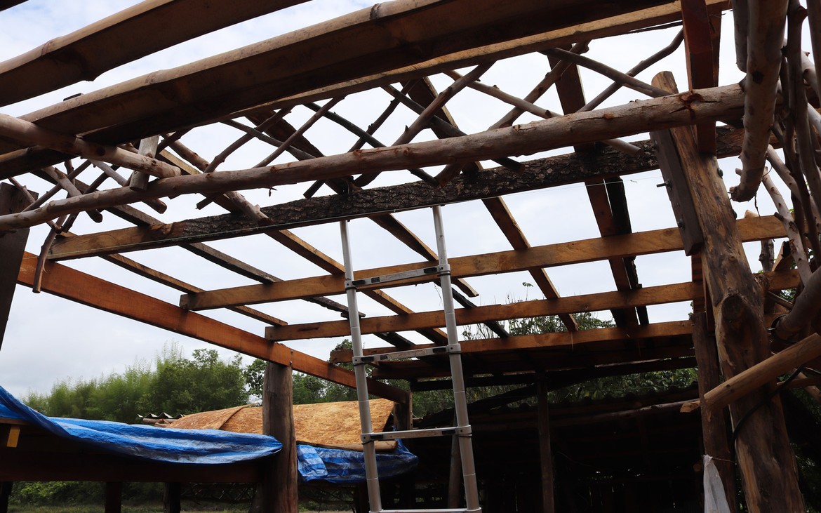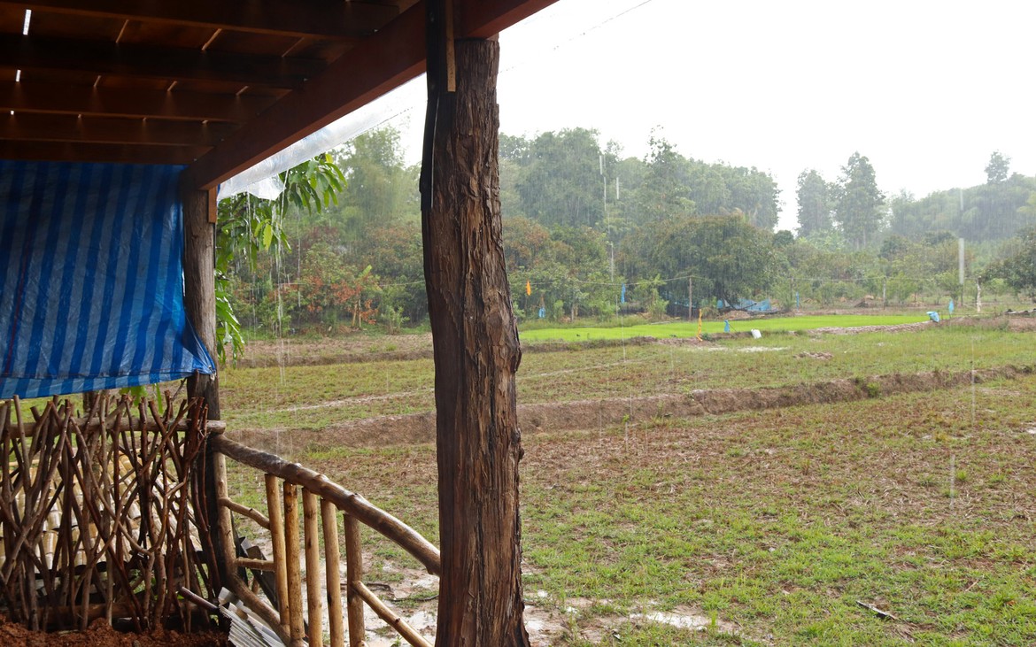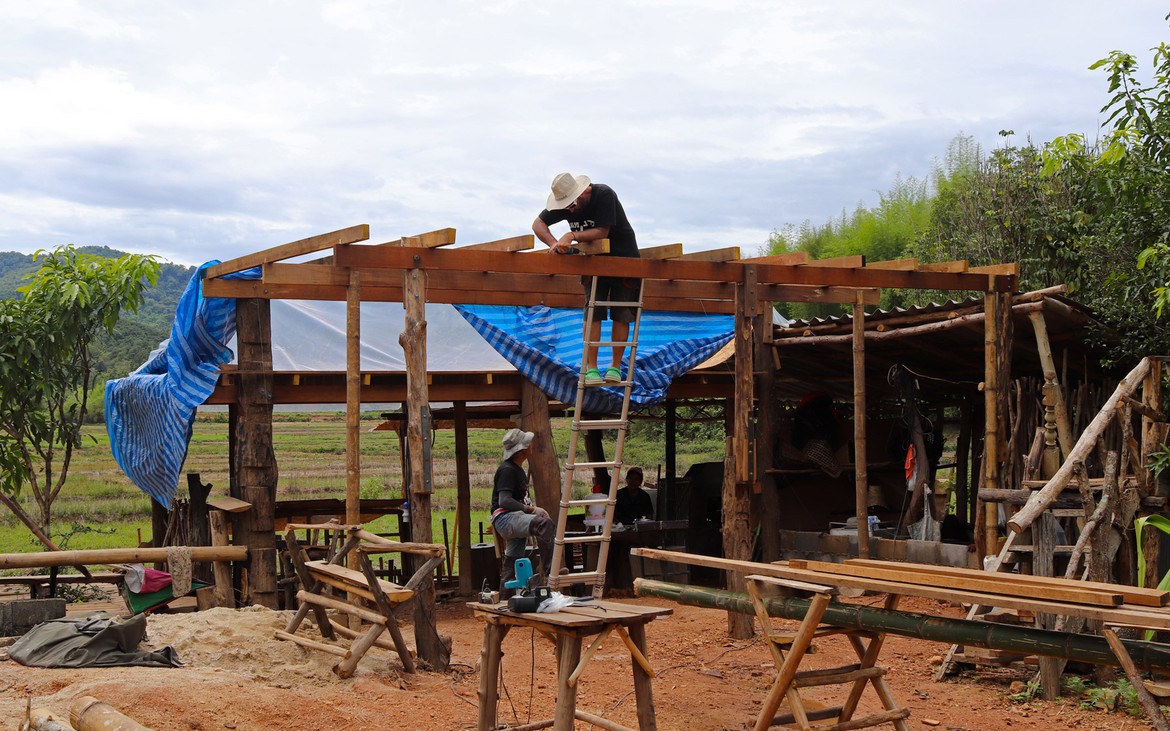 Nous avons tout de même bétonné un troisième pilier en renfort des poteaux existants ce matin. La commande de bois du second plancher ainsi que de l'escalier est passée. Ensuite et en attendant que le béton prenne, nous avons entrepris de rebâcher le premier plancher entre deux averses et de renforcer le mur de soutènement de la construction côté rizières. En effet, avec la pluie, tout le sol se dérobe... Encore une sympathique surprise à rajouter à notre longue liste !