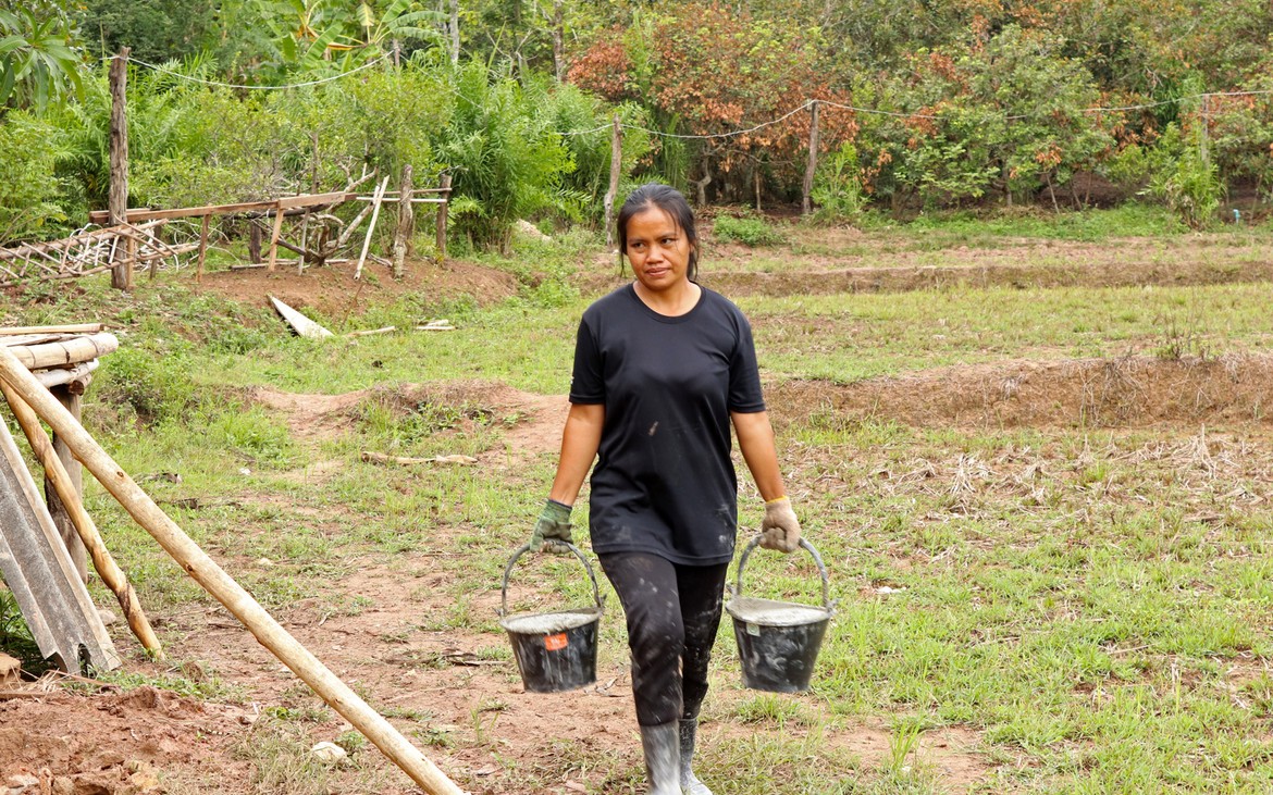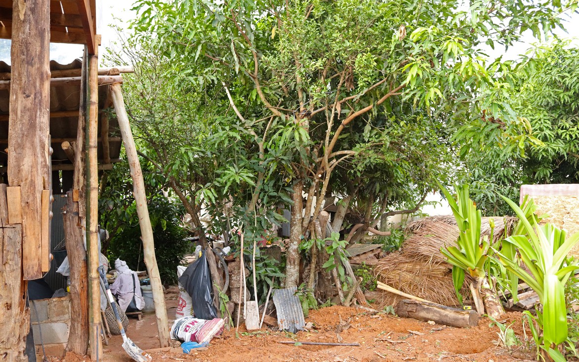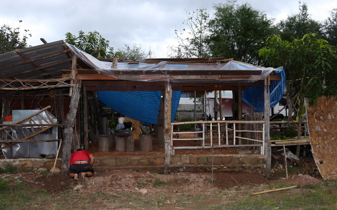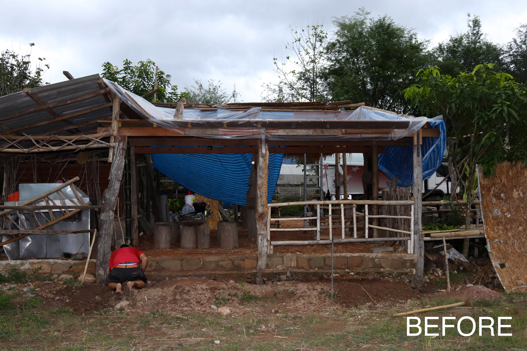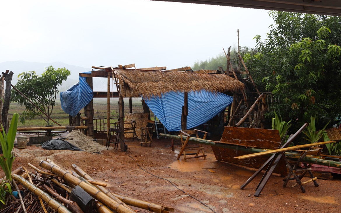 Nous avons tout de même bétonné un troisième pilier en renfort des poteaux existants ce matin. La commande de bois du second plancher ainsi que de l'escalier est passée. Ensuite et en attendant que le béton prenne, nous avons entrepris de rebâcher le premier plancher entre deux averses et de renforcer le mur de soutènement de la construction côté rizières. En effet, avec la pluie, tout le sol se dérobe... Encore une sympathique surprise à rajouter à notre longue liste !