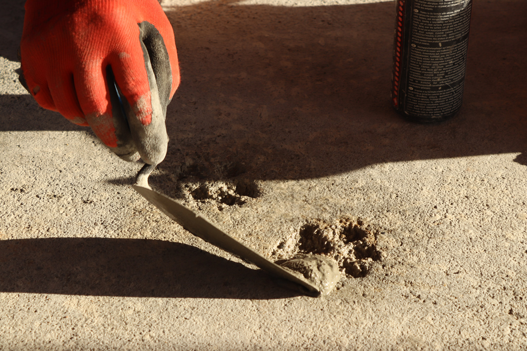 Nous voilà de retour. Le job reprend avec le ragréage des empreintes de pas que ce charmant toutou a laissées comme souvenirs avant notre départ pour la capitale (voir Semaine 4. Encore du béton ! )