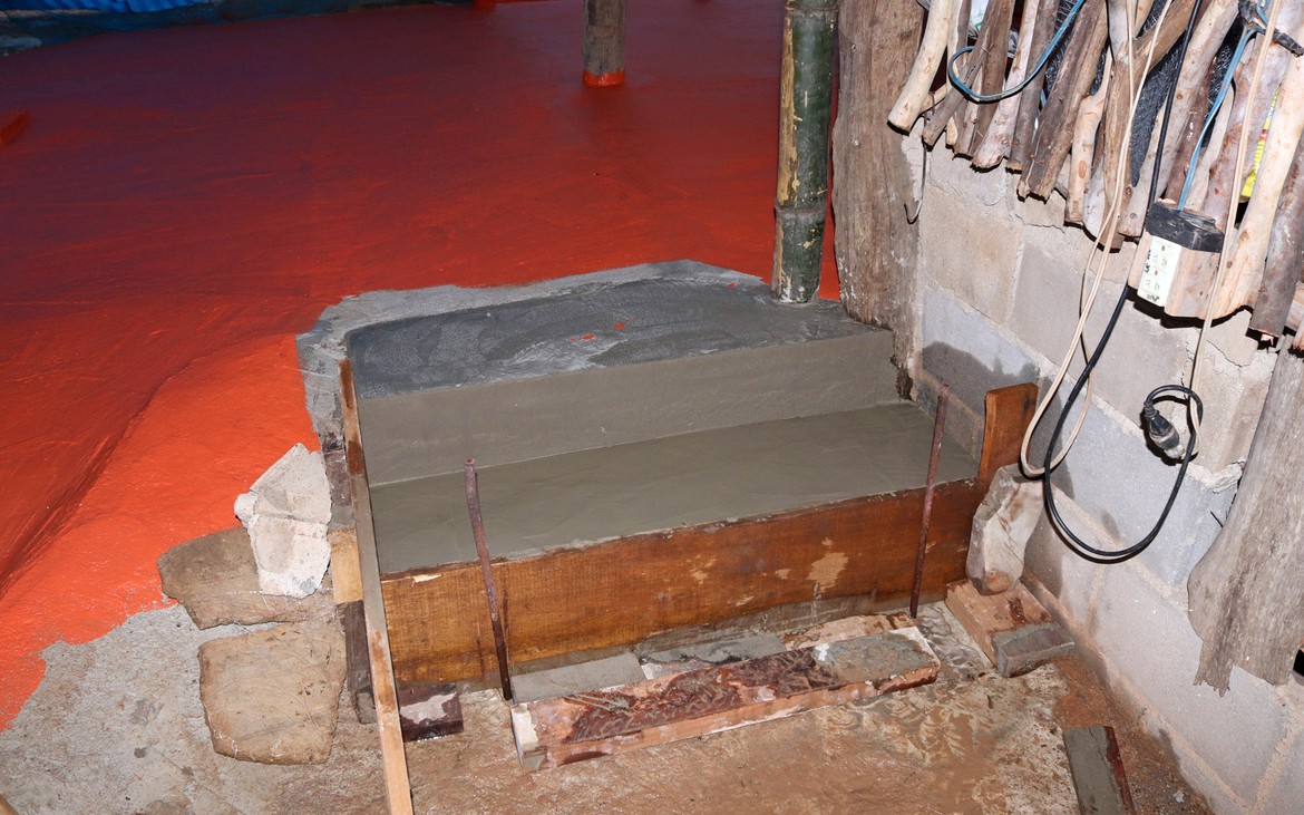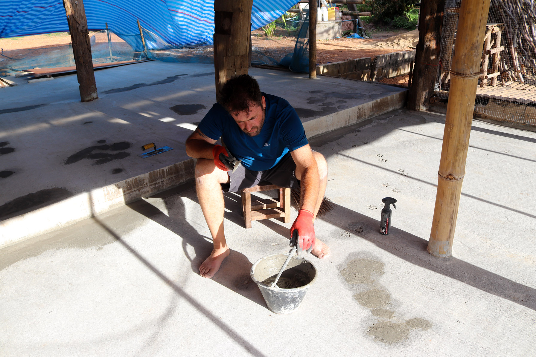 Dans la lancée et comme jamais rien de l’arrête, Mike se remet au béton pour façonner deux marches d’accès depuis la cuisine.