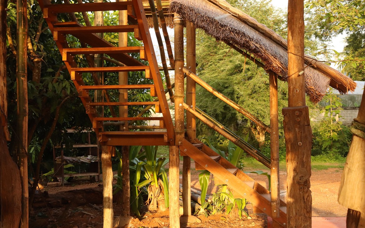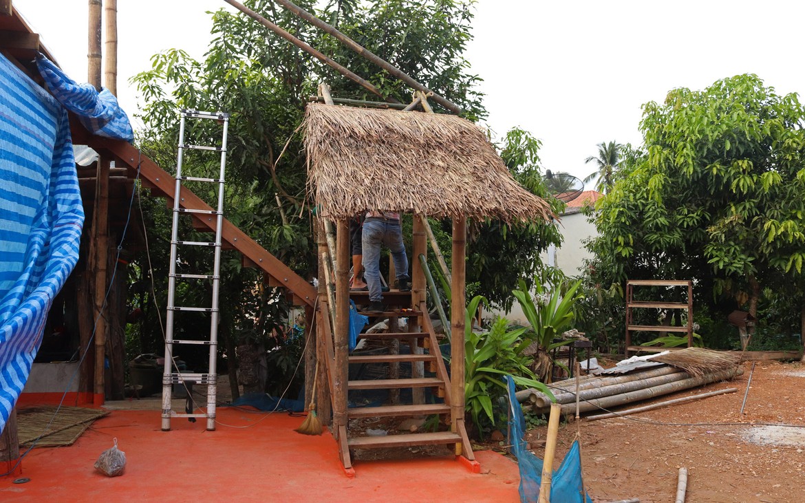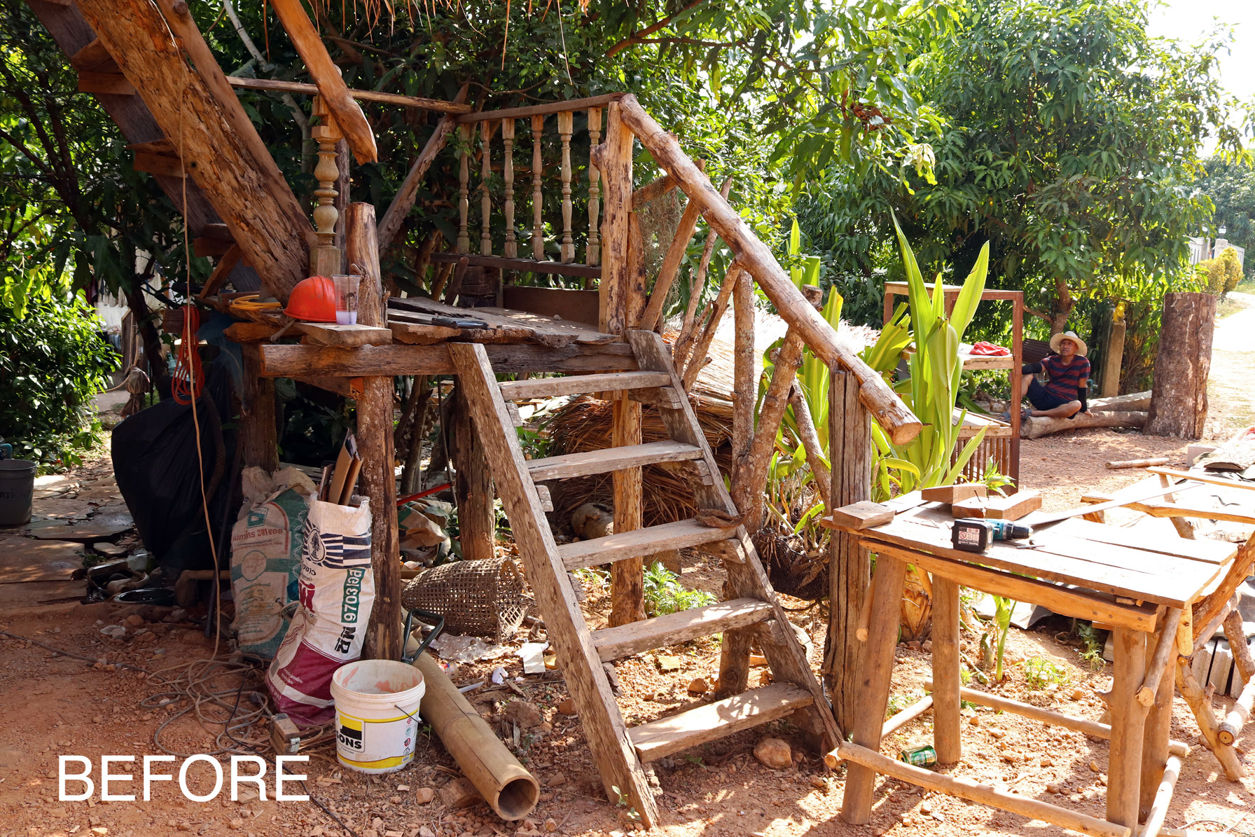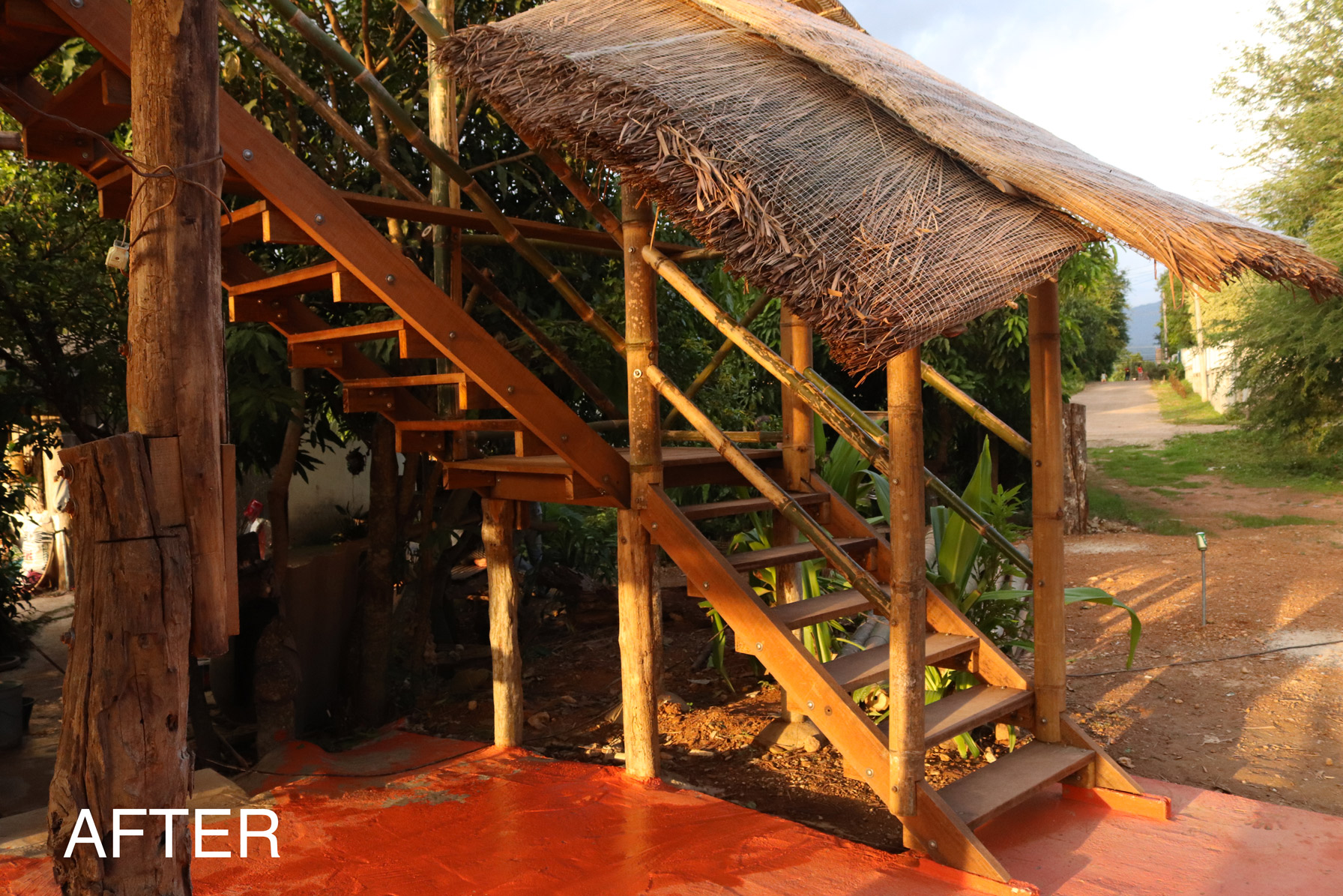 Nous travaillons au rythme des pluies intermittentes de la mousson. Nos amis sont occupés aux champs. Ils peuvent enfin procéder à la plantation du riz ! Depuis 2 jours, Mike souffre d'un œil qui l'oblige à un repos forcé. Je suis donc seule à poursuivre le travail de l'escalier qui est à ce jour, et mise à part une dernière main courante, terminé !