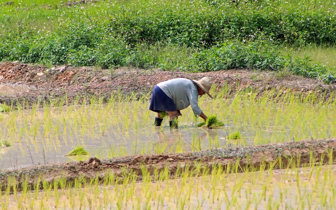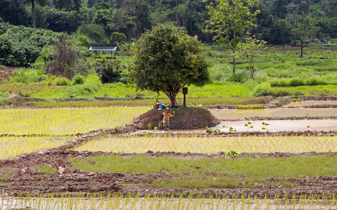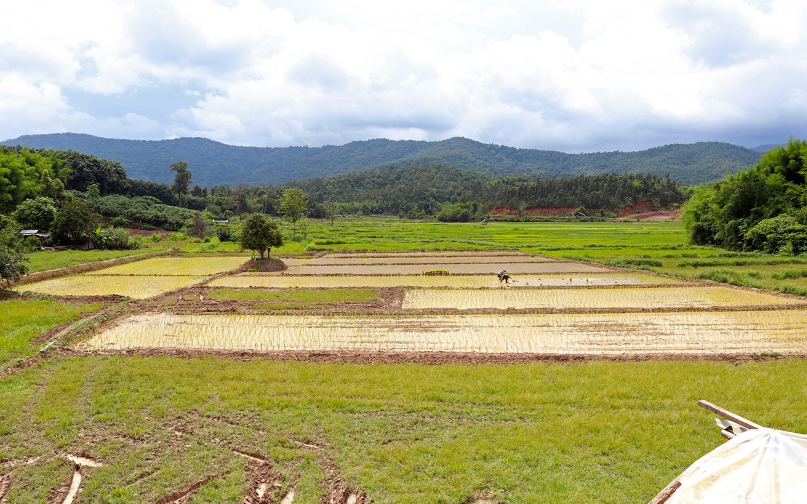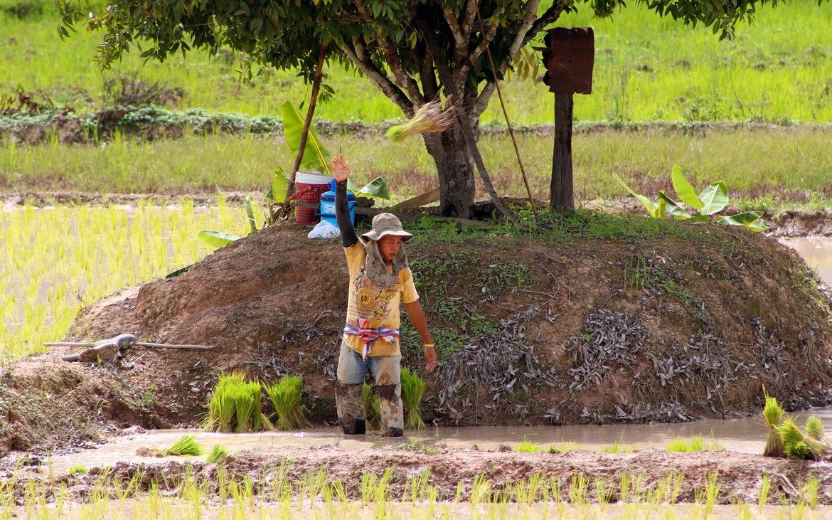 A côté du chantier, Kung et sa femme s’occupent aussi de la récolte des jeunes pousses de riz qu’ils devront ensuite replanter en vue de la récolte finale.