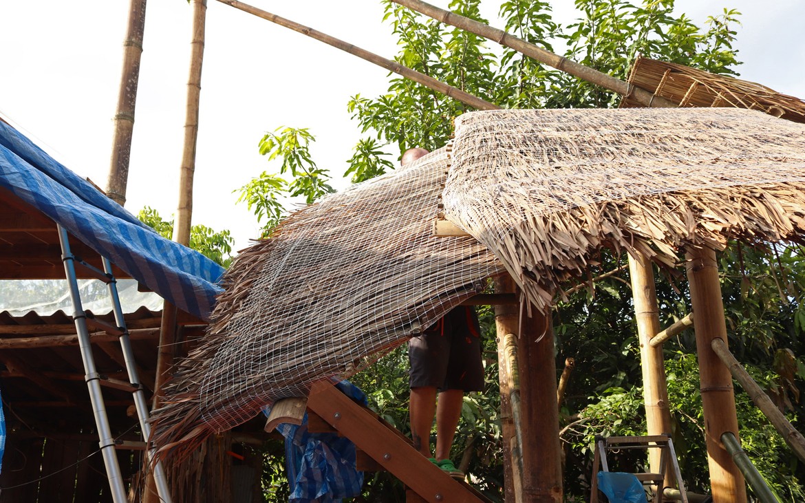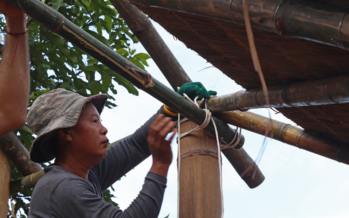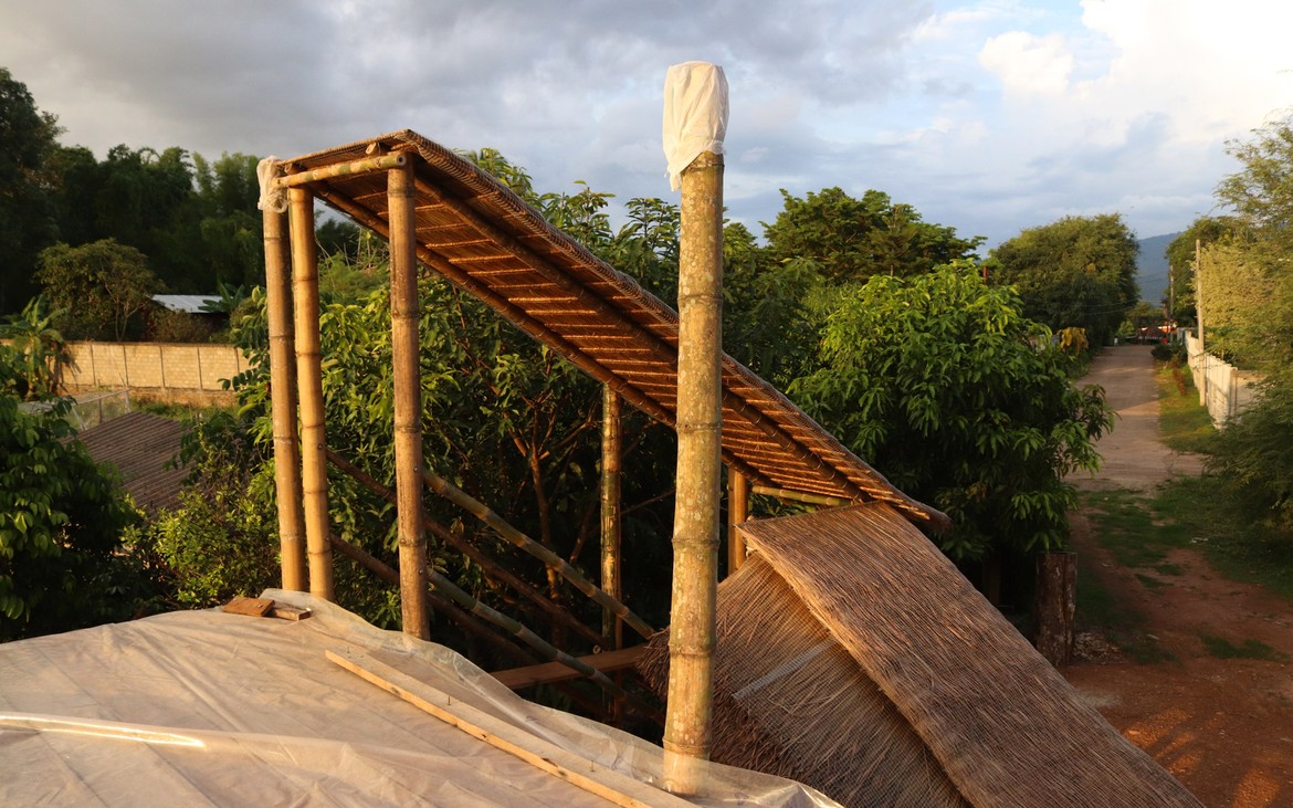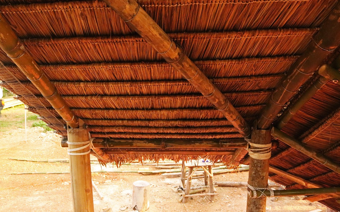 De plus, nous travaillons avec des matériaux que nous ne connaissons pas, bambou, corde et chaume. Entre tutoriels trouvés sur la toile, sens pratiques et réalité, nous devons tester plusieurs méthodes et chacune d'entre elles demandent plusieurs heures de labeur souvent infructueux. Mais voyons le bon côté des choses... : nous apprenons !