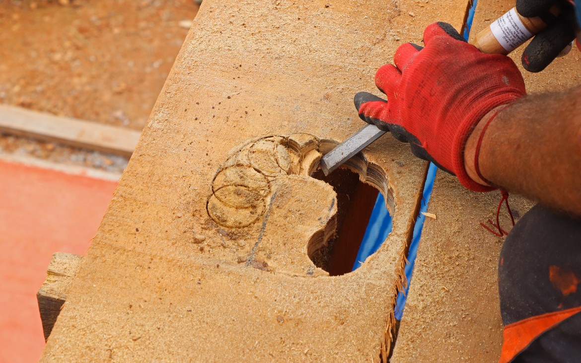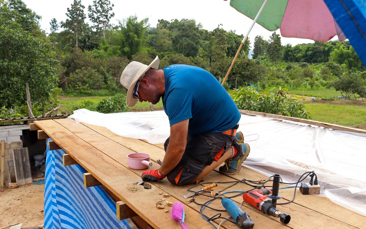 Il est temps de passer à une nouvelle étape : celle des travaux de la toiture qui débute avec le prédimensionnement des premiers poteaux. Nous n’avons absolument pas le matériel adéquat. Il nous faut une nouvelle fois improviser.