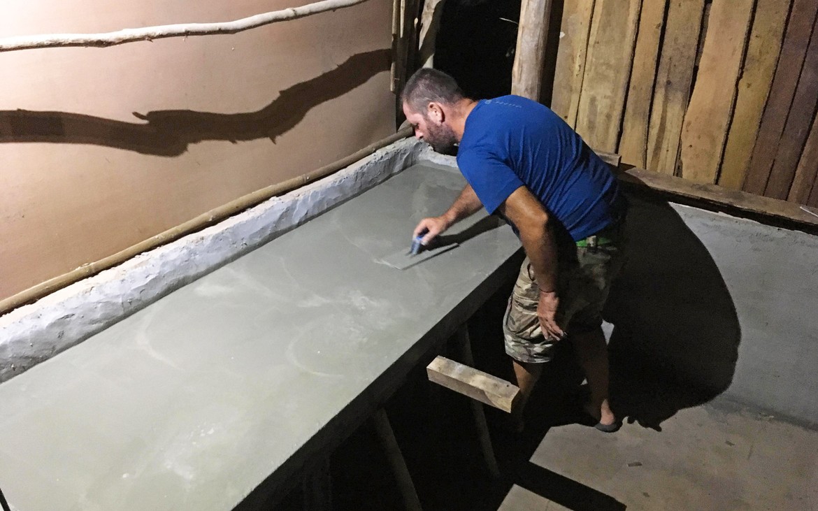 Nous découvrons le résultat du plan de travail de la cuisine. Ça a l'air pas mal. Il va falloir maintenant patienter que le béton sèche avant de décoffrer et de carreler.