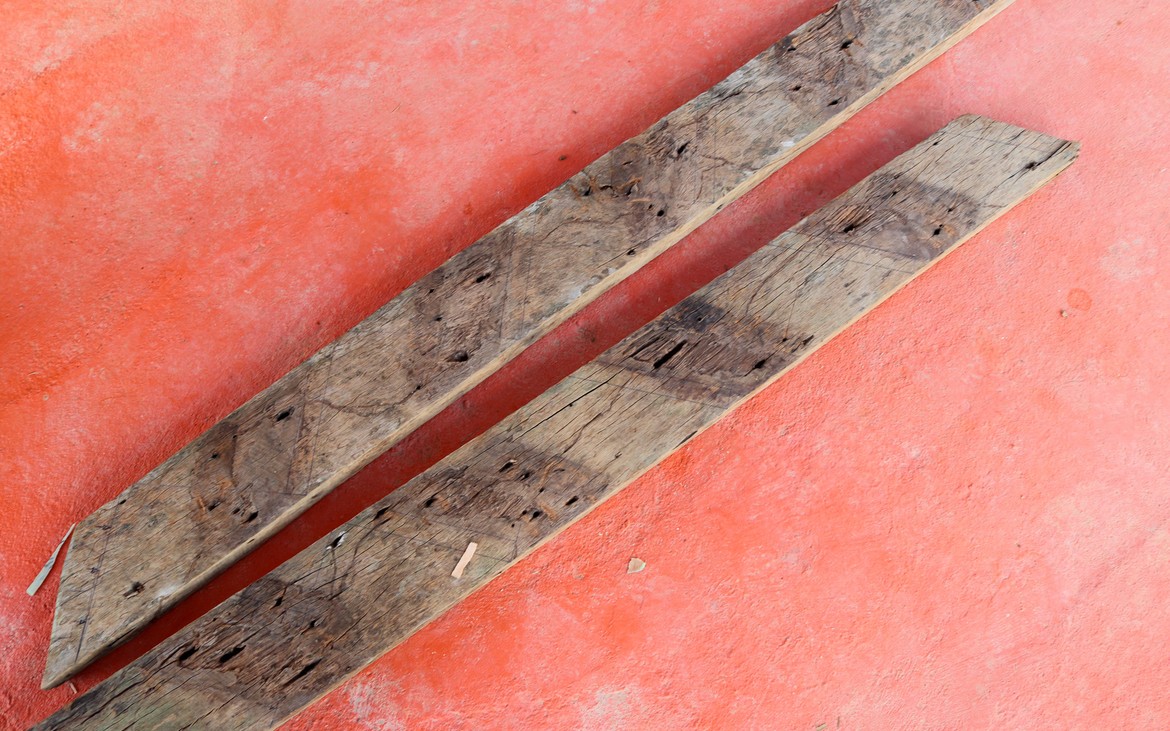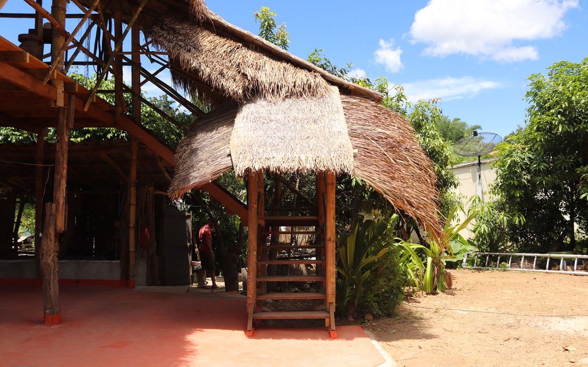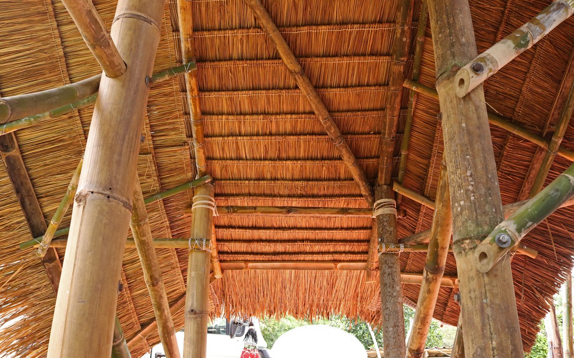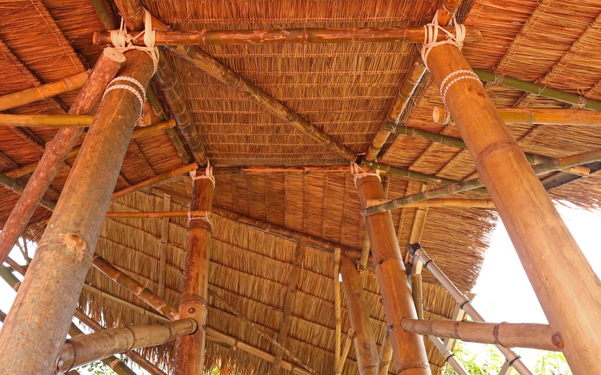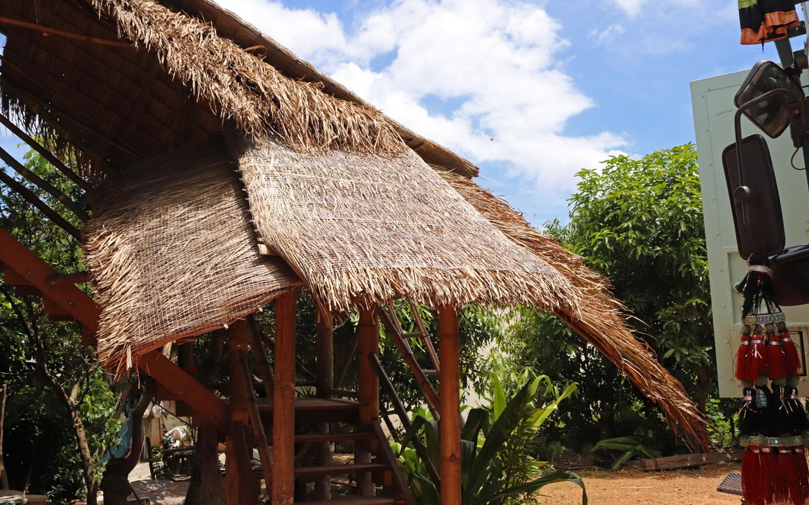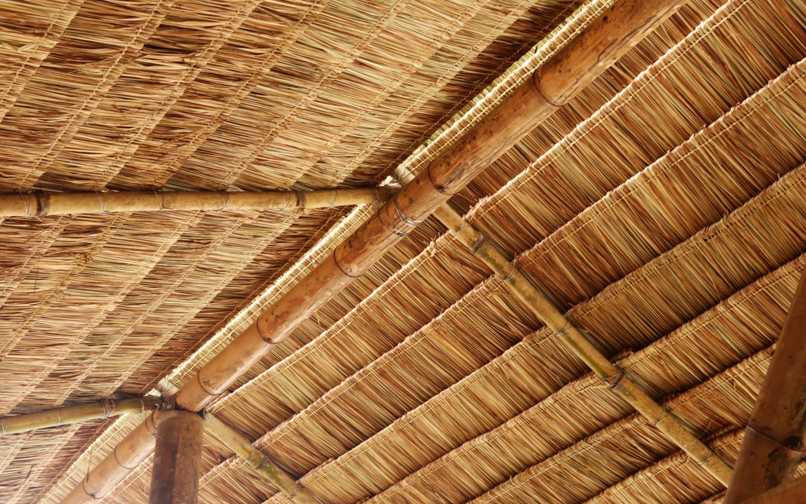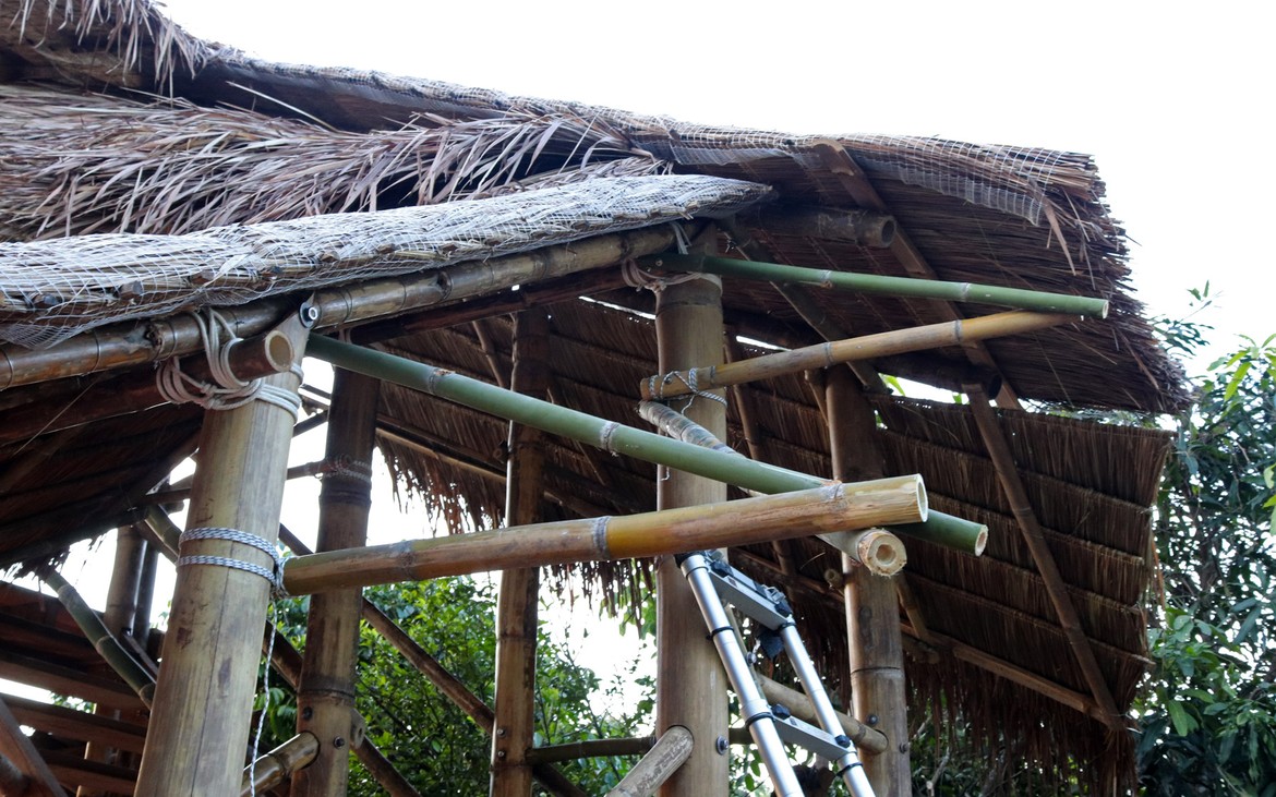 La toiture est achevée à la satisfaction de tout le monde. Les filets sont posés et les derniers chaumes sont en place. Testée et approuvée : il ne pleut plus à l'intérieur.