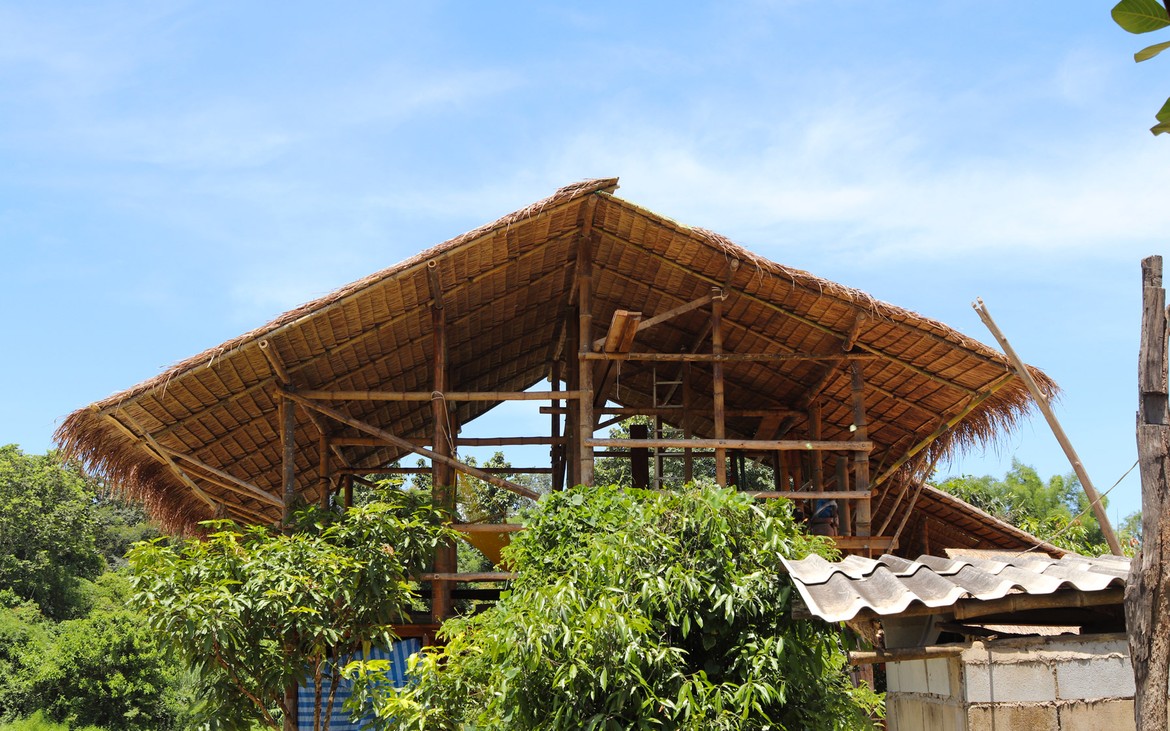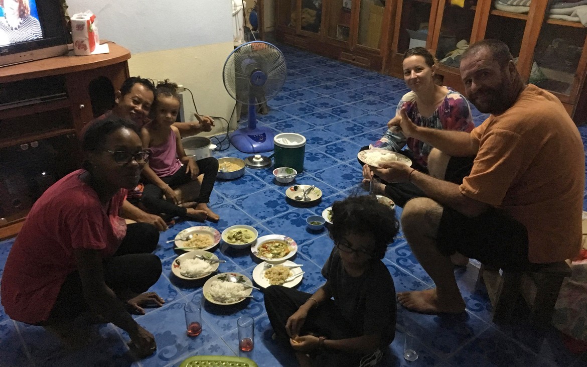 Nos journées de labeur se terminent toujours autour d’un repas partagé dans la maison de Kung. La famille s’agrandit pour quelques jours ! Et c’est par terre, à la façon thaïlandaise, que nous nous régalons des mets préparés en notre honneur.