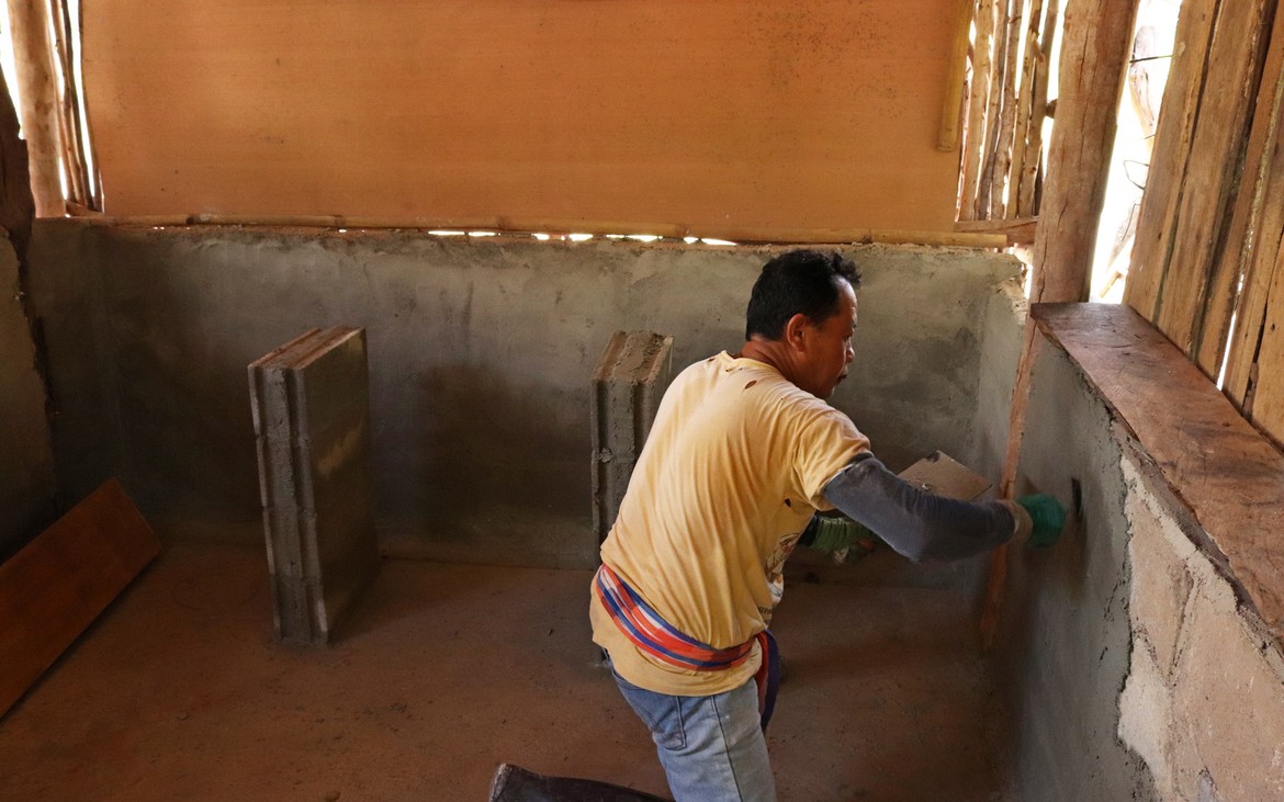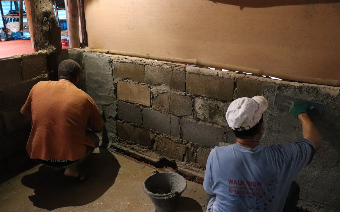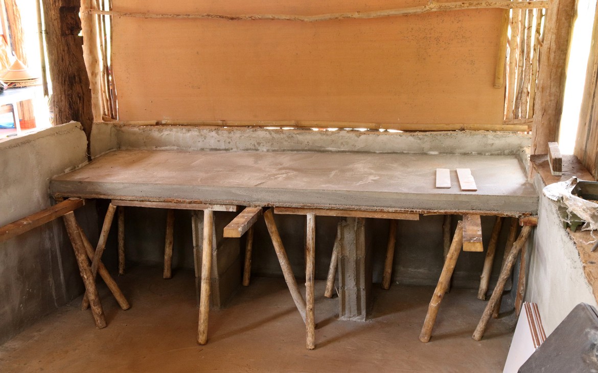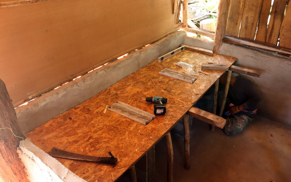 Kung et sa femme poursuivent la mise en place de l'enduit sur les murs de la cuisine et deux pieds sont maçonnés pour recevoir le futur plan de travail.