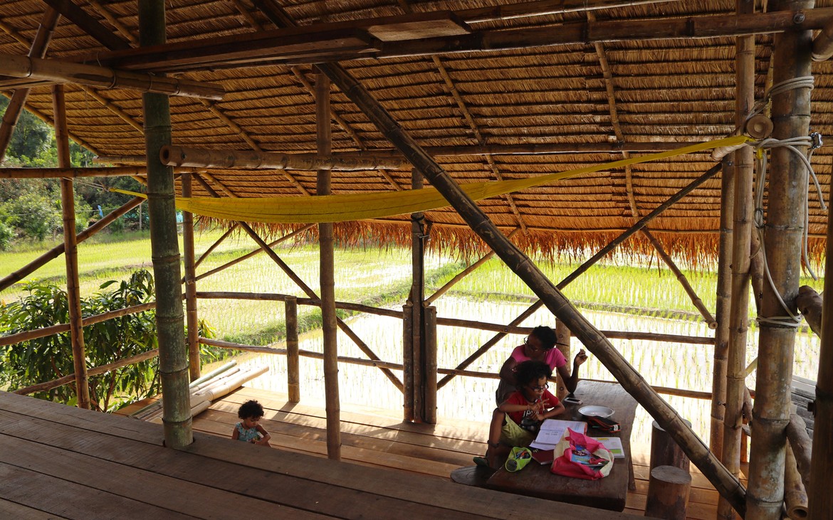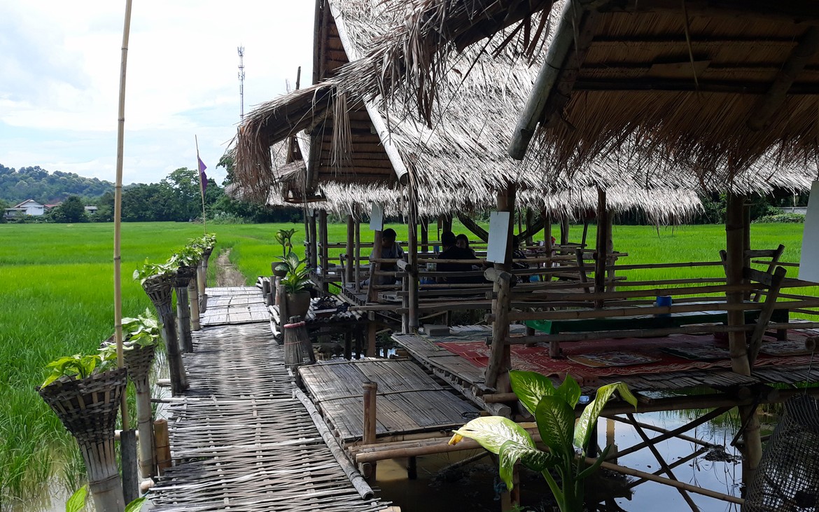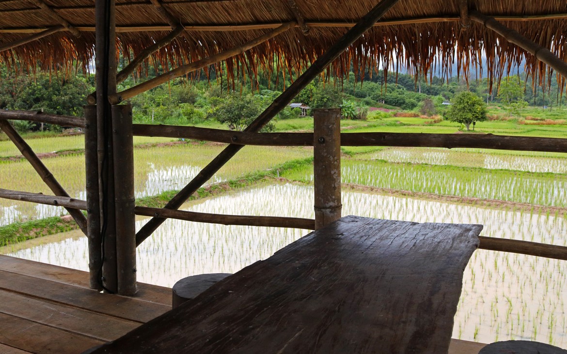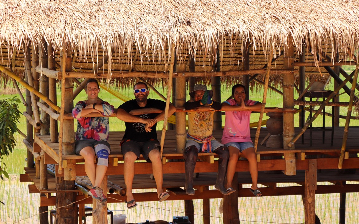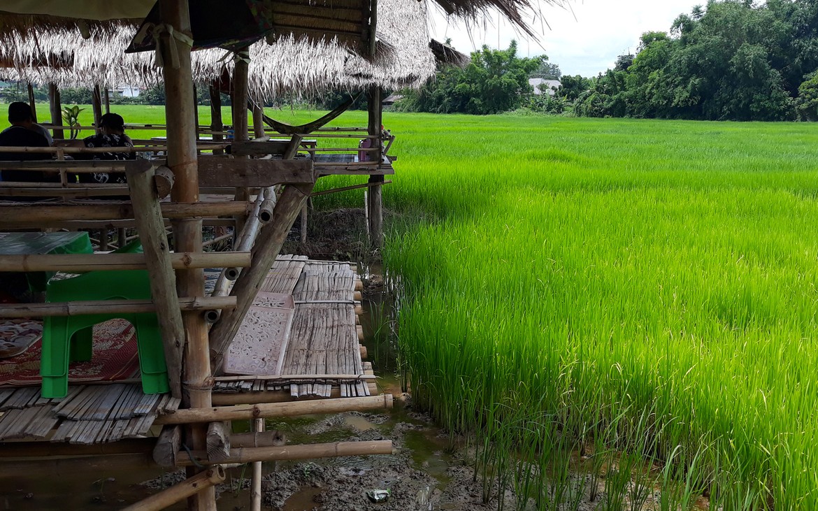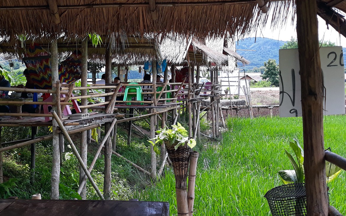 Documents en poche et sourire aux lèvres, nous reprenons la route pour Ban Thung Sai. Nous nous arrêtons manger dans un joli établissement au bord des rizières qui n’est pas sans nous rappeler celui que nous venons de construire et qui nous donne quelques idées pour notre ami Kung et le développement futur de son restaurant.