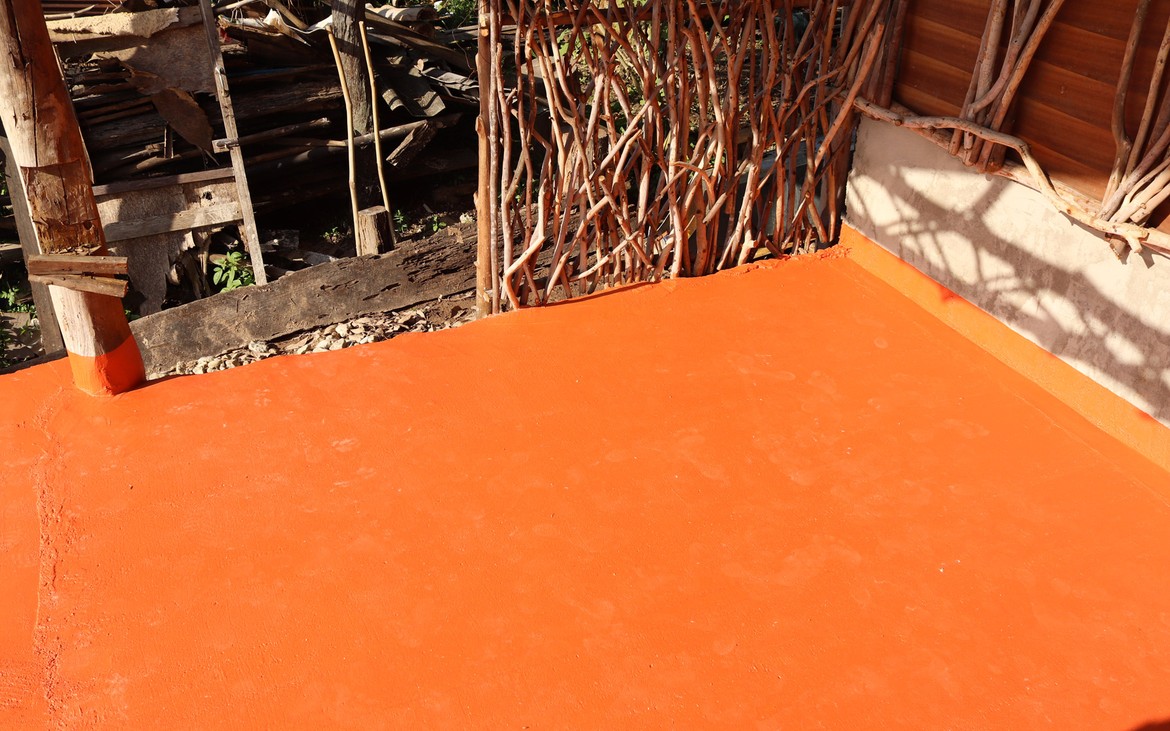 La troisième dalle du rez-de-chaussée, bétonnée le 25.08.2019, reçoit sa couche de peinture.