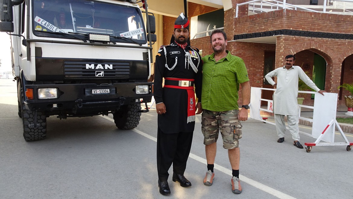 Comme on s'y attendait, la sortie du pays se fait sans encombre. Le personnel est agréable. Notre Exit Letter est acceptée sans discussion. Les carnets de passage sont timbrés rapidement. Et nous nous engageons avec le camion au milieu des arènes montées pour le spectacle quotidien du Wagha-Attari Ceremony . Il est 15h45 (heure pakistanaise; Inde +0h30) et nous sommes les derniers à traverser les grilles avant la clôture de la douane pour la nuit. Les gens s'amoncellent déjà de part et d'autre de la frontière pour assister à la cérémonie à venir. Mike en profite pour faire quelques clichés avec les garde-frontières dans leur tenue de parade. Ils sont toujours aussi imposants !