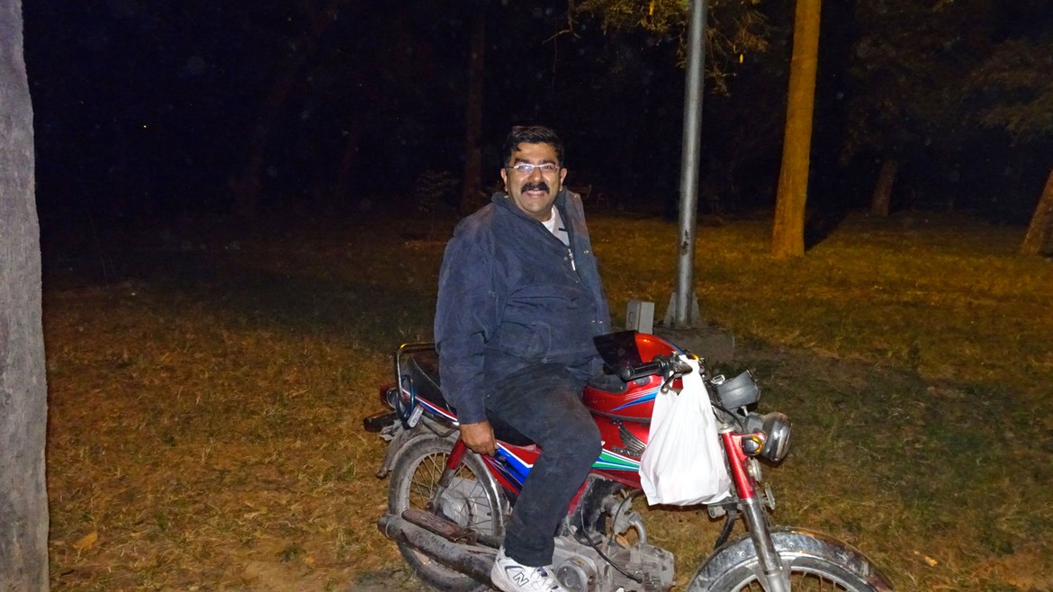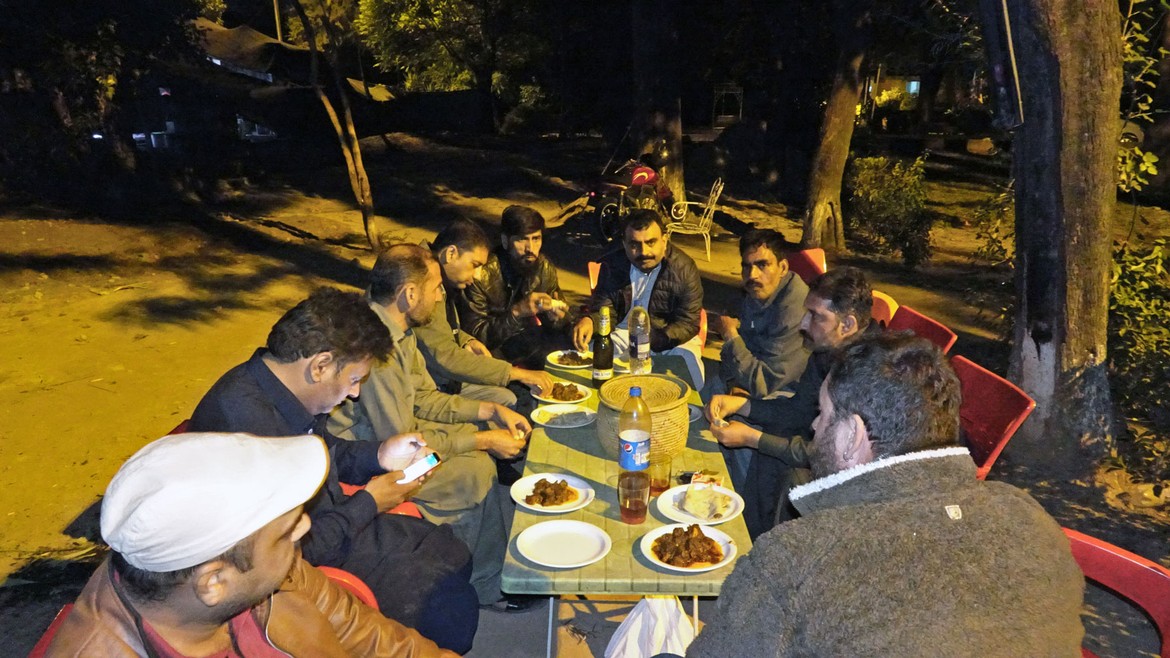 Nous sommes à peine parqués qu'on vient frapper à notre porte. Sheraz se présente à nous. Ses amis et lui sont réunis dans le parc pour jouer aux cartes et partager un repas et nous sommes cordialement invités à les rejoindre. Nous apprenons qu'il s'agit là d'un petit rituel quotidien où une dizaine à une quinzaine de copains se retrouvent quelques heures après le travail.