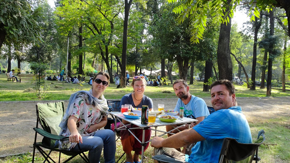 De mon côté, ça va un peu mieux. Du coup, nous profitons de ce beau dimanche ensoleillé pour manger avec Ursel et Janus, un couple allemand, installé sur le même parking que nous avec leur Iveco Daily II 4x4 – tellement petit comparé à notre Antares – et également en attente de documents pour garantir leur retour au Pakistan après leur voyage en Inde. Ils en sont à leur troisième déplacement en Asie (http://asienreisende.de) et donc au Pakistan, un pays qu'ils apprécient particulièrement. Une belle occasion de partager nos expériences de voyage et surtout le plaisir de nous retrouver entre Européens, pendant que Lahana chasse les écureuils.