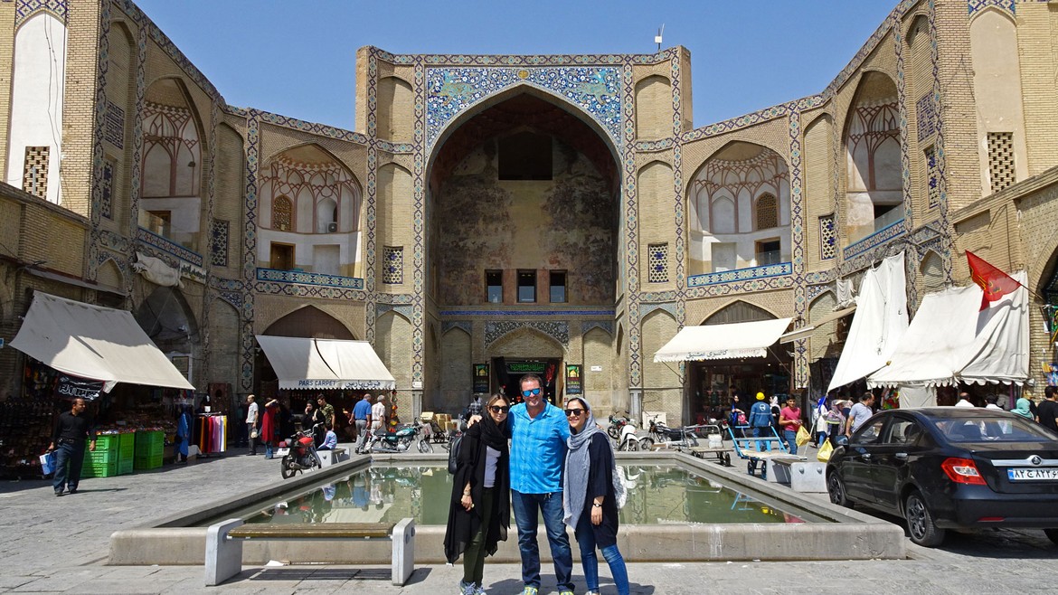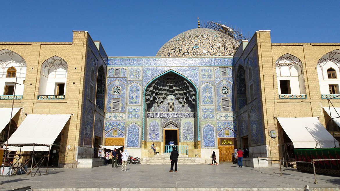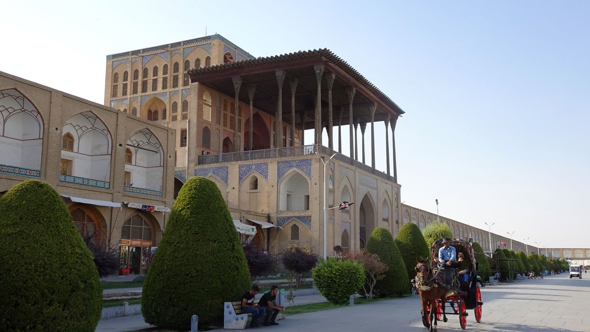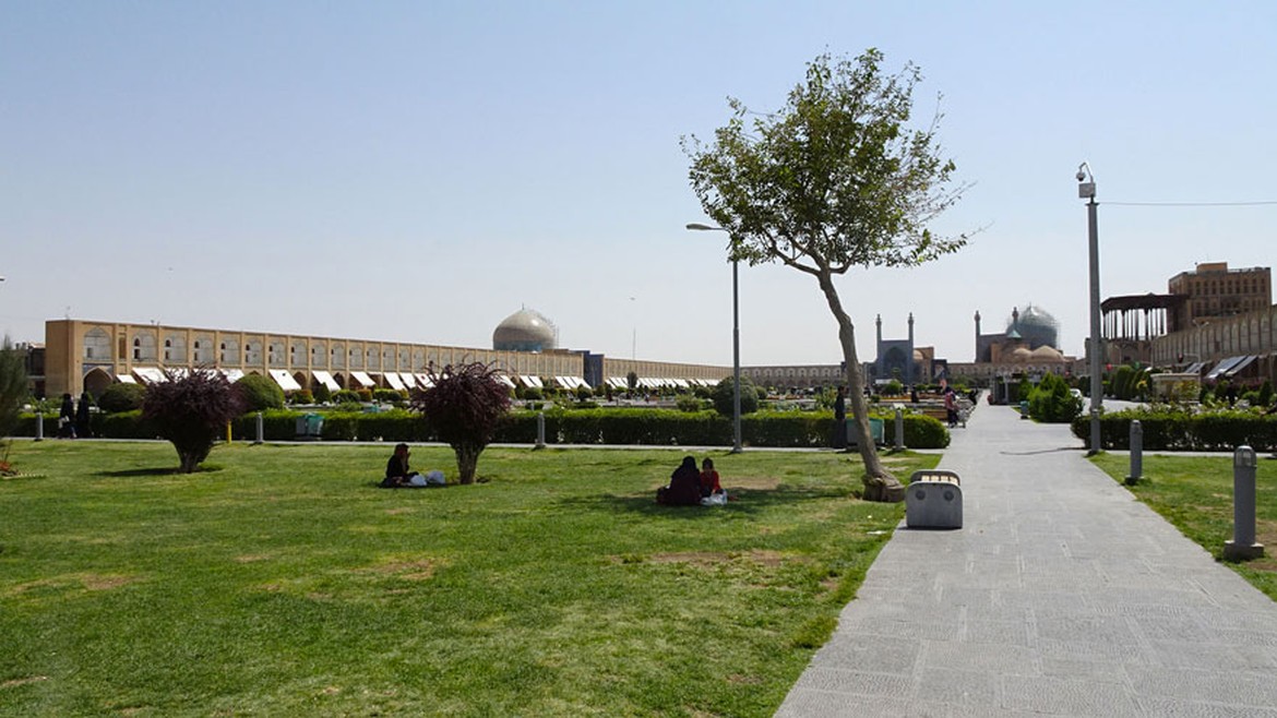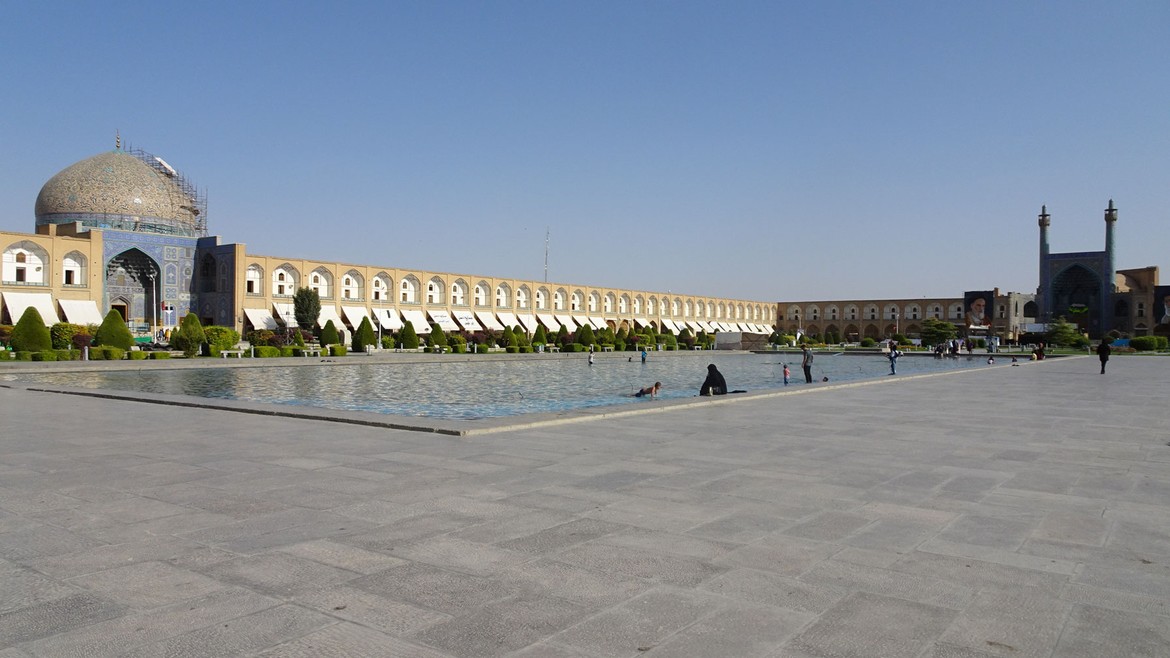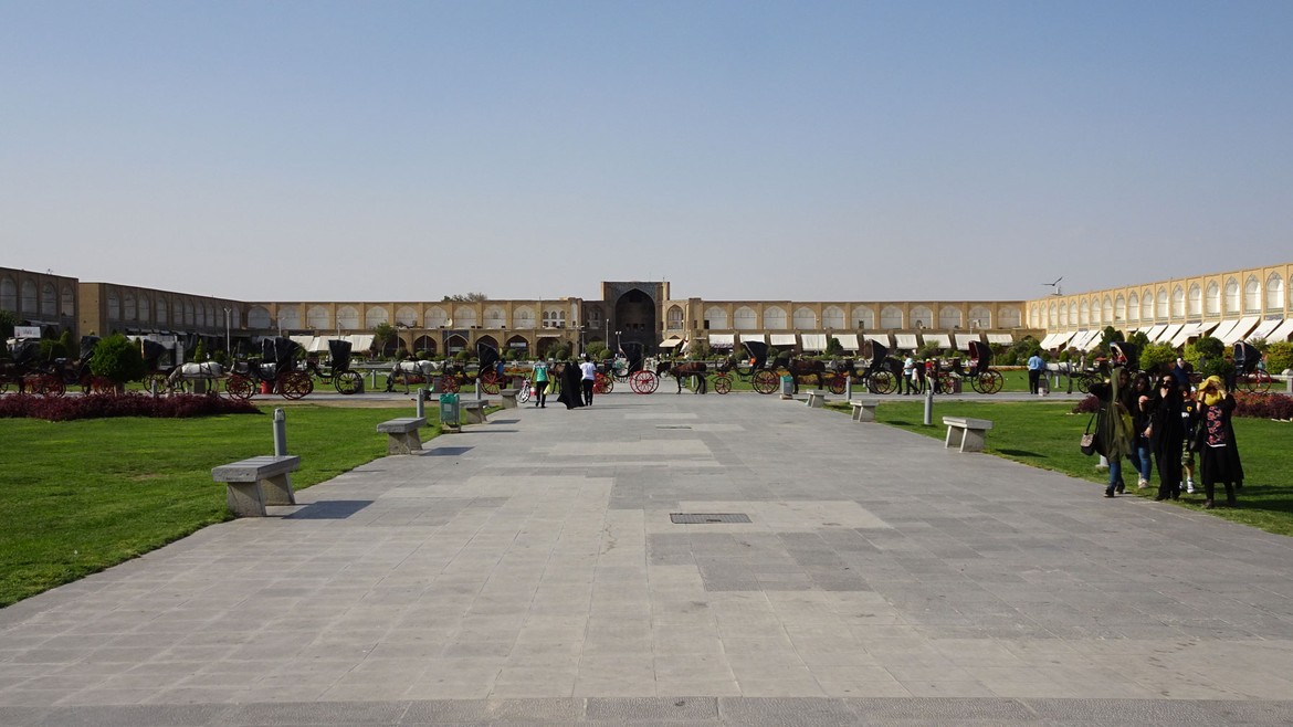 La visite se poursuit au Naghsh-e Jahan Square, ou place de l’Imam, une des plus grandes places du monde : 560 mètres de long pour 160 mètres de large. Elle est entourée par des monuments historiques importants de l’époque safavide, réunissant en un même lieu les pouvoirs religieux avec la mosquée du Shah, commerciaux avec le Grand Bazar et monarchal avec le palais Ali Qapu. La mosquée du Cheikh Lotfallah complète l’ensemble architectural.