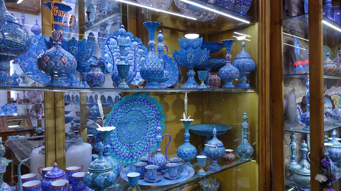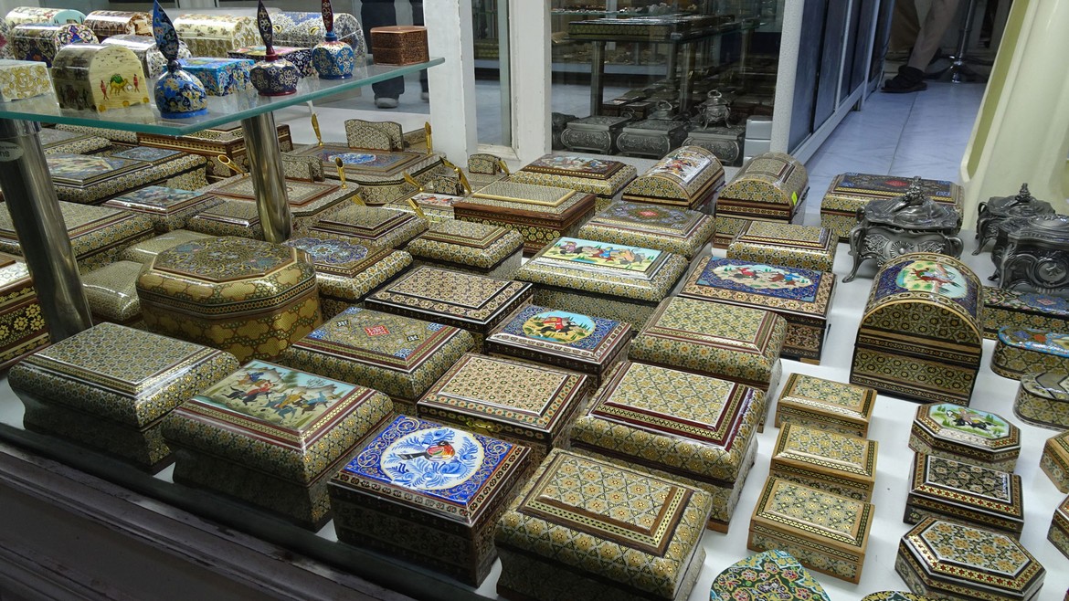 Ispahan est réputée pour son artisanat local. Il y en a pour tous les goûts : tapis persans, émaillage sur cuivre (Mina Kari), gravures (Ghalam Zani), porcelaine, art pictural (Qalam Kari), filigranes ou encore marqueterie fine (Khatam Kari). Si nous apprécions la qualité des produits présentés, nous avons de la peine à faire comprendre aux commerçants que nous voyageons et qu’il ne nous est pas possible de stocker de souvenirs dans notre camion déjà oh combien trop chargé ! Il faudra nous contenter de nos quelques photos.