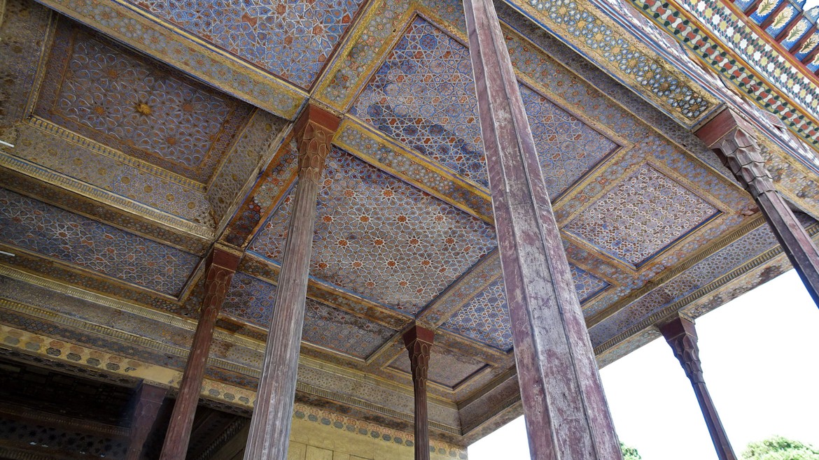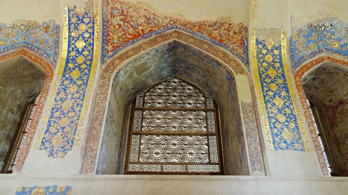 Le lendemain, nous passons notre journée en compagnie de deux étudiantes en architecture fraîchement diplômées, Lia et Rana, qui se proposent de nous faire découvrir la ville. Elles nous emmènent d’abord voir un palais royal safavide du 17e siècle qui était utilisé pour les cérémonies de couronnement et pour la réception des ambassadeurs étrangers. A l’extérieur, vingt colonnes de bois se reflètent dans le bassin du jardin attenant d’où son nom : Chehel Sotoun, qui signifie quarante colonnes. La salle d’audience est richement décorée et présente de nombreuses peintures murales représentant la puissance et le courage des souverains et de leurs guerriers.