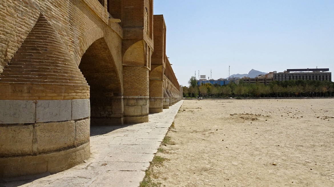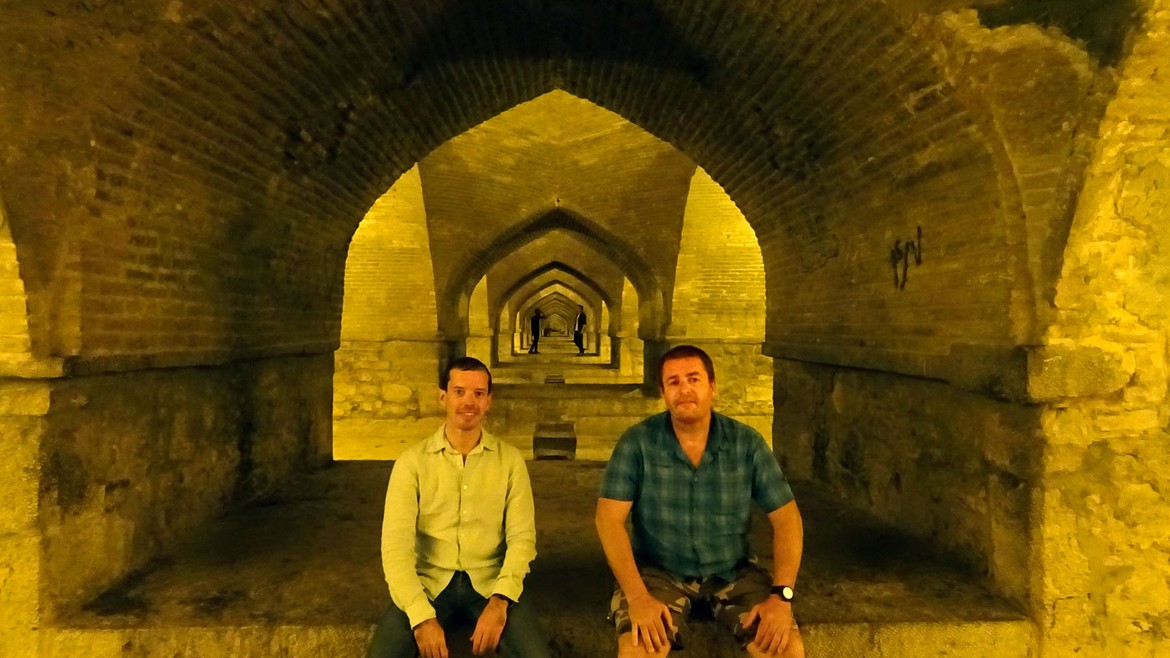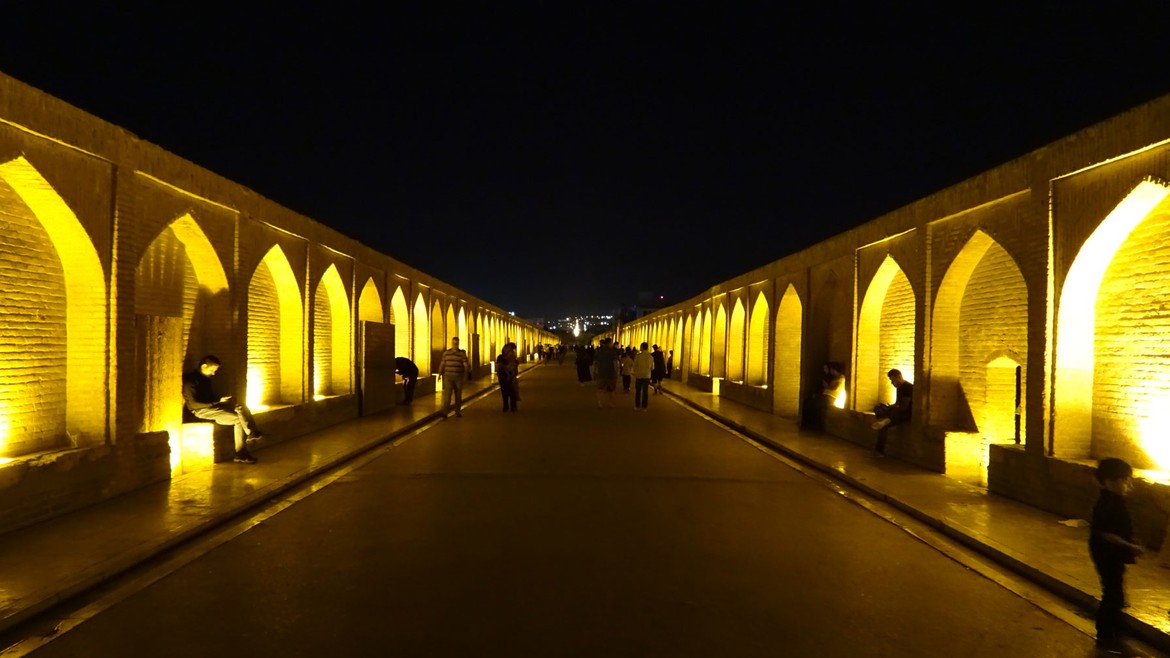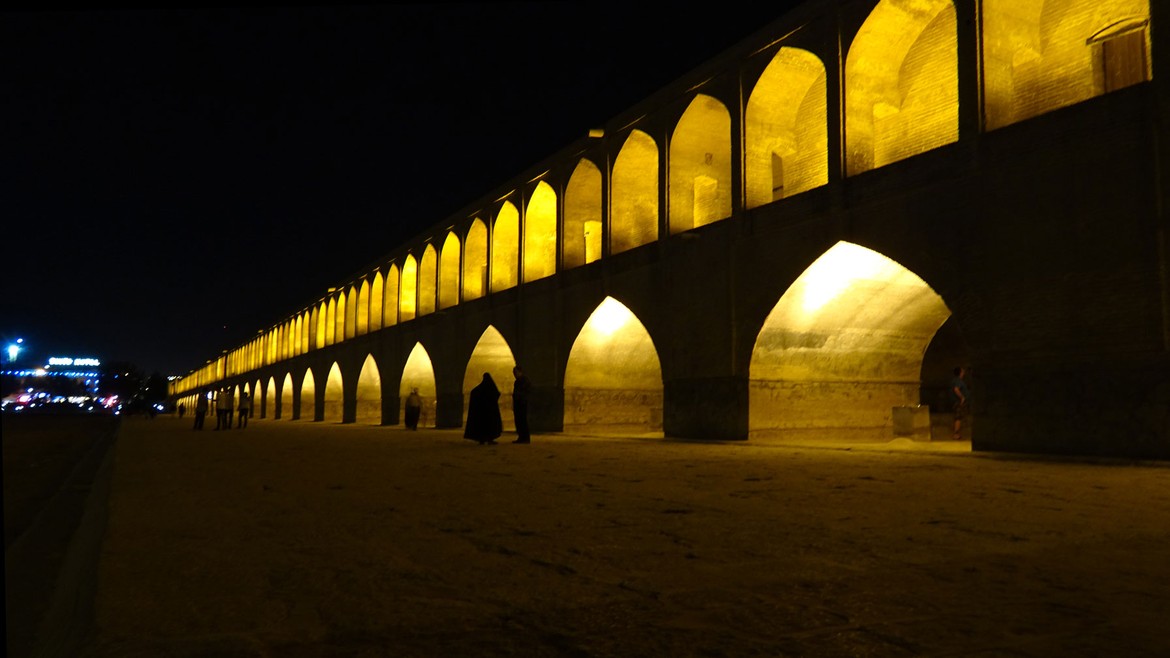 ... et visite de nuit du pont Allahverdi Khan ou « pont aux trente-trois arches » (Si-o-Se Pol) construit en 1608. Il est l’un des onze ponts d’Ispahan. Nous aurons l’occasion de le voir aussi de jour : spectacle impressionnant de ses arches en fond de décor des terres arides et du sol asséché depuis plus de deux ans au profit des champs et des cultures situés en dehors de la ville.