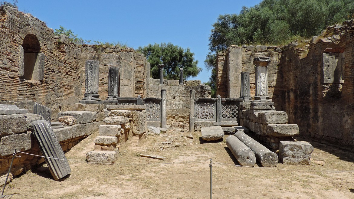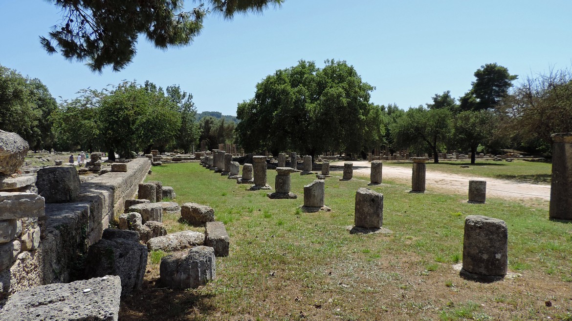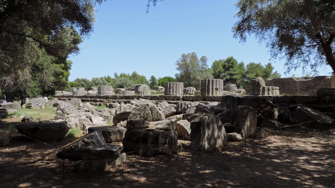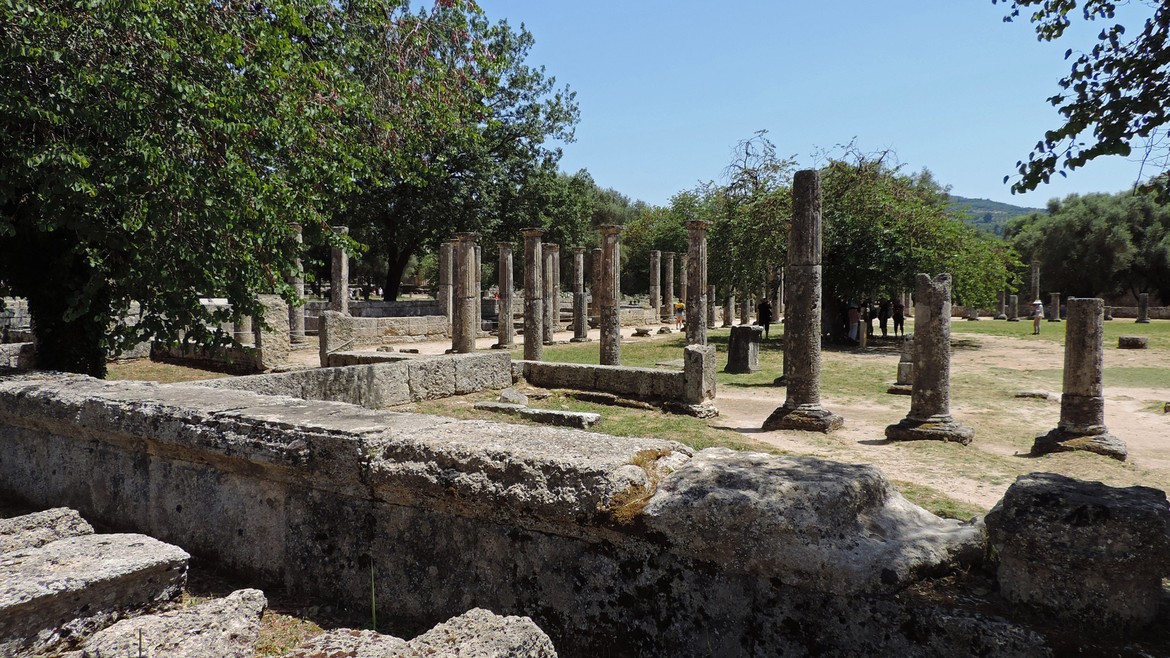 Nous nous arrêtons à Olympie qui accueillit les jeux olympiques dans l’Antiquité. Le sanctuaire, dédié à Zeus, est assez vaste et suscite l’intérêt. On reconnaît les fondations des bâtiments de plusieurs époques. Par contre, et à notre grand étonnement, peu, voire même aucune des structures, n’a été reconstituée. Le parc est bien entretenu mais la végétation recouvre une partie des pierres et des mosaïques qui ont simplement été protégées à l'aide de bâches. Les éléments de colonne ou de murs semblent posés aléatoirement à même le sol. Habitués de la mise en valeur de nos sites romains, le « laisser-aller » du site d’Olympie surprend : manque de financement ? de soutien politique ? de cohérence archéologique ? … ou peut-être un peu de tout ça à la foi !