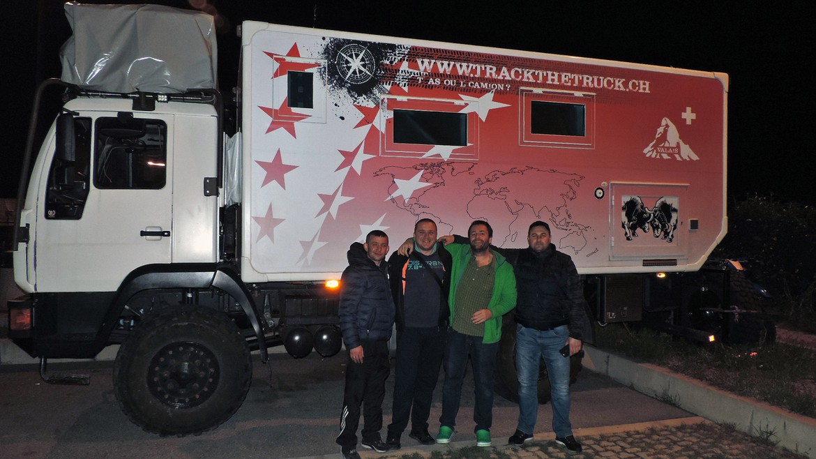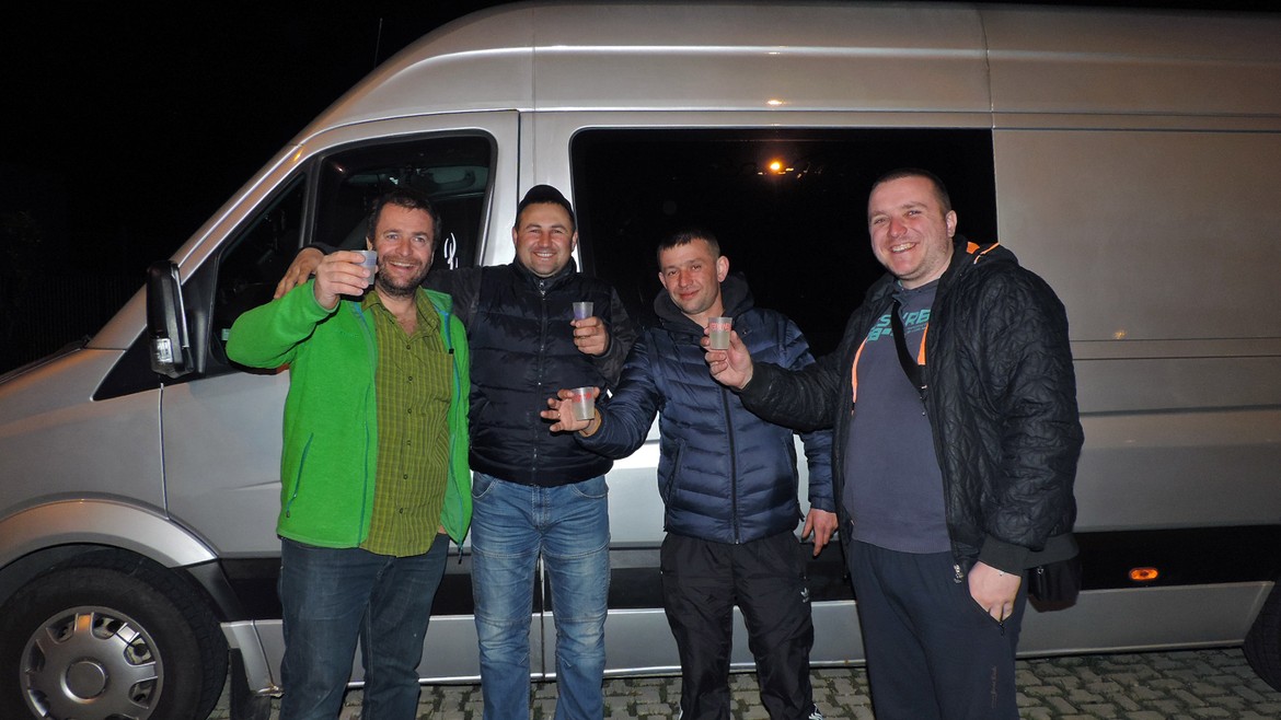 Nous décidons de nous arrêter pour la nuit sur une aire d’autoroute près de Venise. Pas très conviviale, me direz-vous ? Détrompez-vous. A peine arrivés, voilà que Mike rencontre trois Ukrainiens avec qui il ne tarde pas à partager le verre de l’amitié. Voilà nos quatre compères suisso-ukrainiens en train de siroter une petite gnôle bien de chez nous sous fond de musique ukrainienne sur une place de station-service italienne à gesticuler et balbutier en italo-russe. Qui dit mieux ?