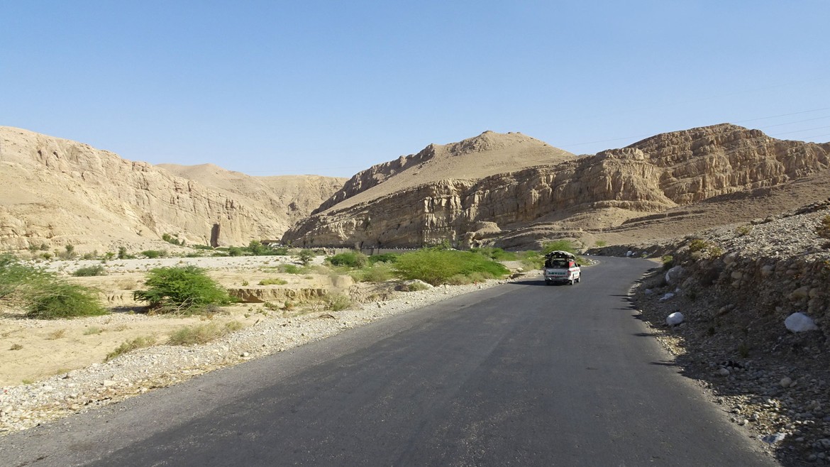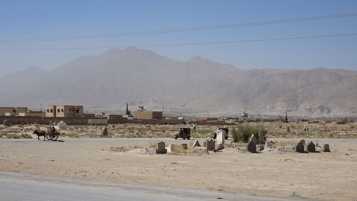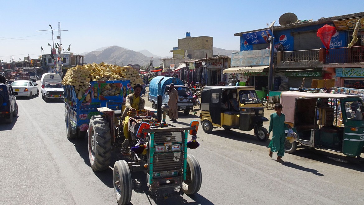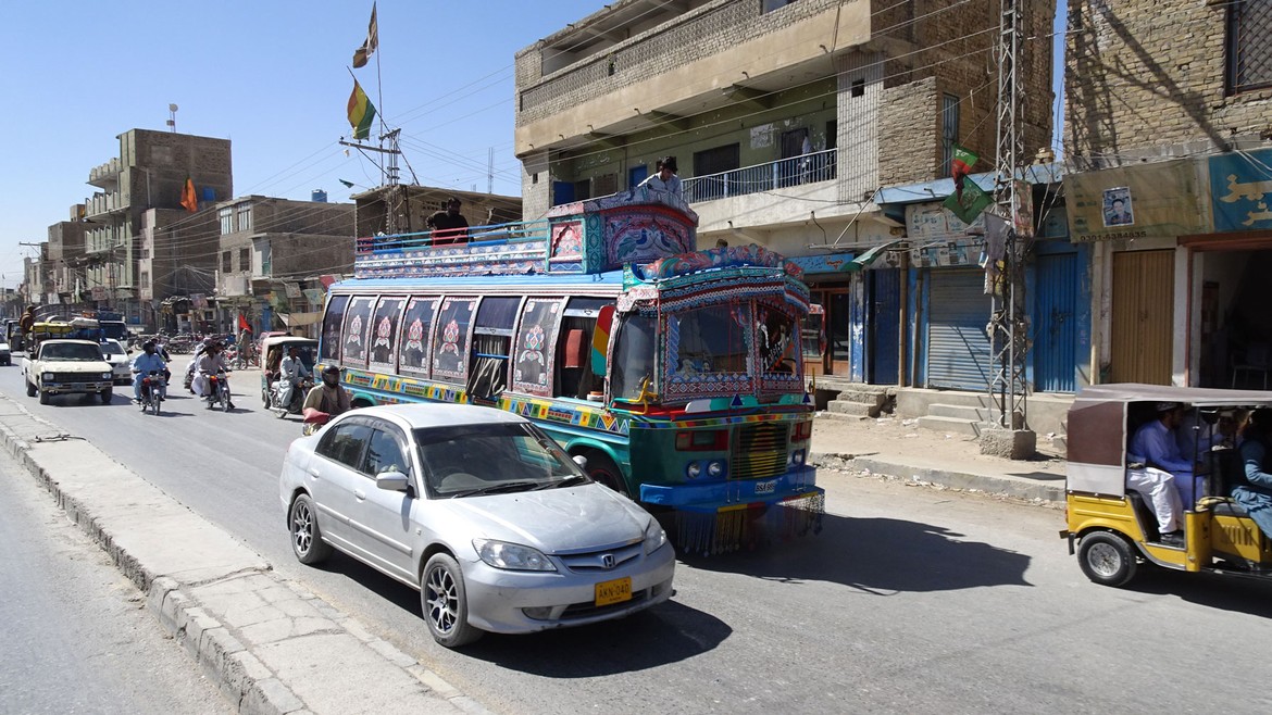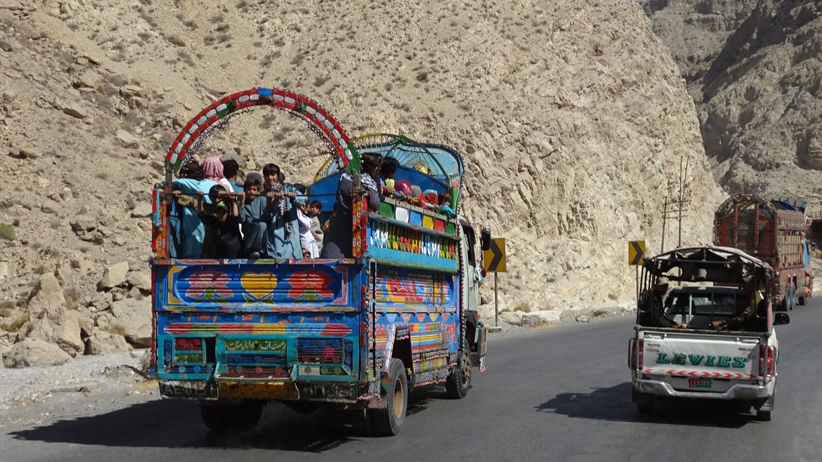 Nous quittons Quetta et son brouhaha frénétique après les selfies d’usage. Dans le pêle-mêle de la rue, nous volons encore quelques clichés ici et là. Il est difficile de rendre compte en images de l’effervescence de la ville tant il y a de choses à voir : les chargements insolites, la diversité des véhicules animés des couleurs du truck-art, les marchands de rue et leurs étals multicolores, les femmes et leurs belles tenues brodées, des animaux en tout genre et finalement la ville qui s’éloigne gentiment avec les montagnes en fond de décor. Quel dépaysement !