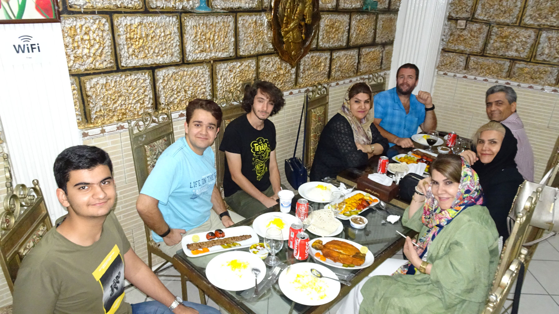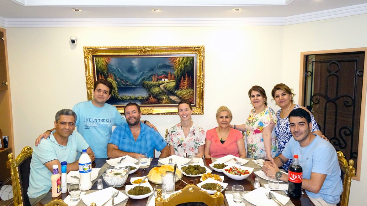 En soirée, Joseph nous rejoint, puis c’est toute la famille d’Amirreza qui débarque au camion. Quelle délégation : ses parents, les deux sœurs de sa maman et son frère. Si nous nous attendions à ça ! Après la visite d’Antares, nous partons manger tous ensemble et passons une très agréable soirée en leur compagnie, à tel point que nous sommes d’ores et déjà invités pour le repas du lendemain chez Nasrin, une des trois « power sisters », comme aime à les appeler Mike.