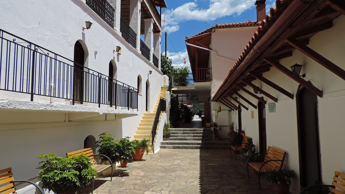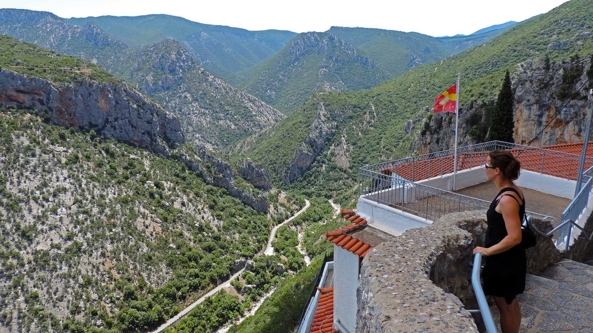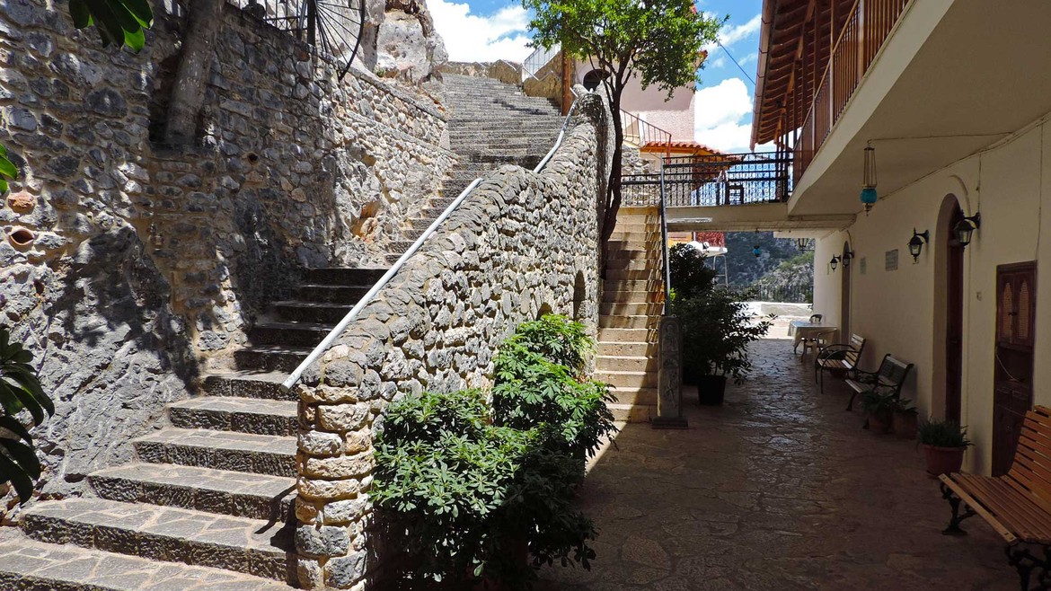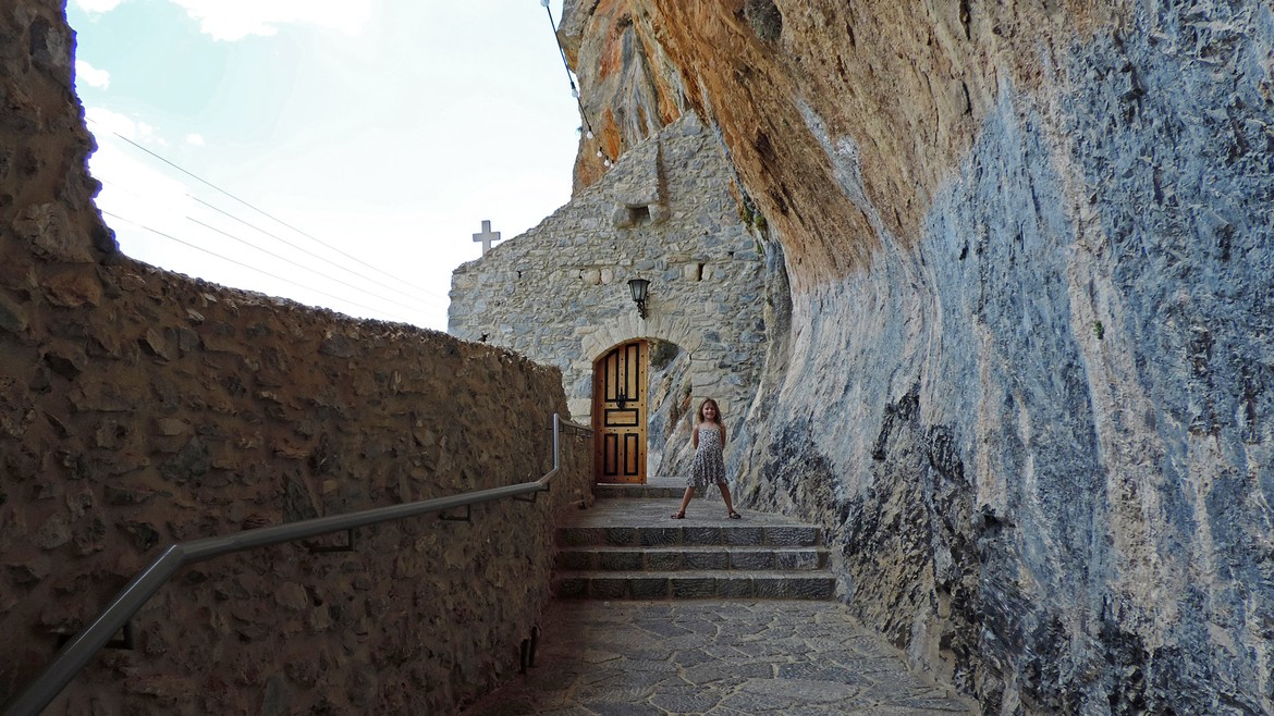 Deux visites à la clef aujourd’hui avec d’abord Moni Elonis. On s’y rend en serpentant les routes qui longent le cours d’eau Réma Dhafnón. Le monastère surplombe la vallée et semble accroché à la montagne. Le calme et la sérénité règnent ici. L’accès se fait à flan de falaises avant d’atteindre une série de bâtiments pour aboutir à la chapelle. Cette dernière abrite une icône de la Vierge attribuée à Saint-Luc que l’on ne peut malheureusement pas photographier mais que l’on devine sur l’étendard à l’entrée du groupe d’édifices.