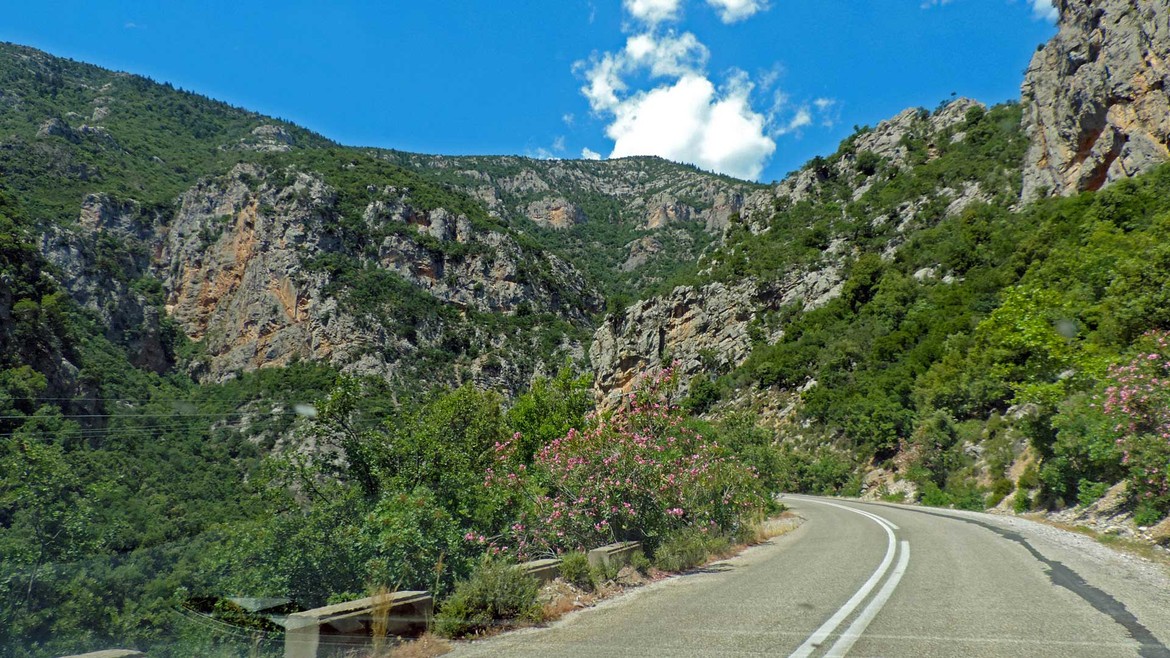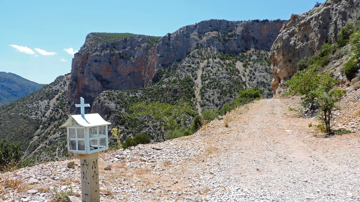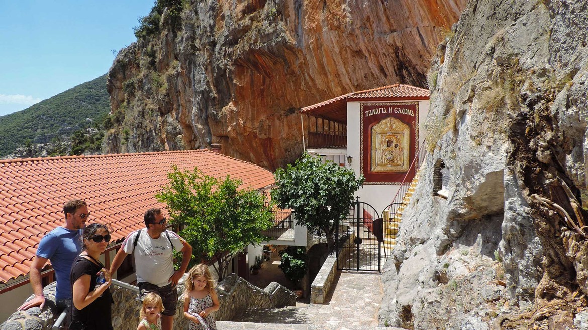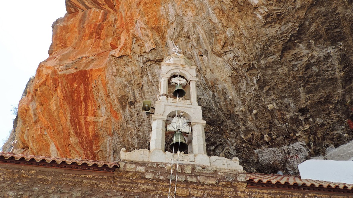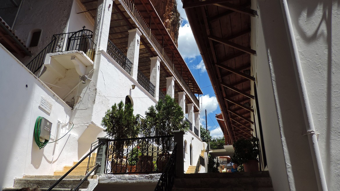 Deux visites à la clef aujourd’hui avec d’abord Moni Elonis. On s’y rend en serpentant les routes qui longent le cours d’eau Réma Dhafnón. Le monastère surplombe la vallée et semble accroché à la montagne. Le calme et la sérénité règnent ici. L’accès se fait à flan de falaises avant d’atteindre une série de bâtiments pour aboutir à la chapelle. Cette dernière abrite une icône de la Vierge attribuée à Saint-Luc que l’on ne peut malheureusement pas photographier mais que l’on devine sur l’étendard à l’entrée du groupe d’édifices.