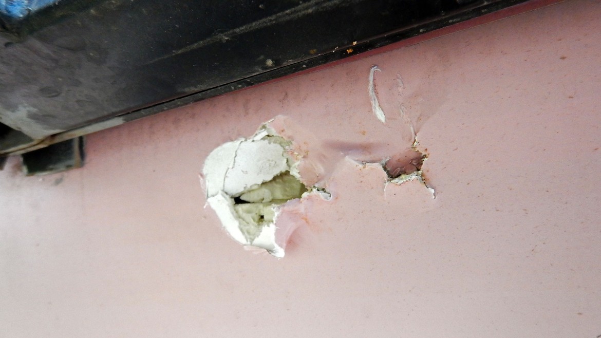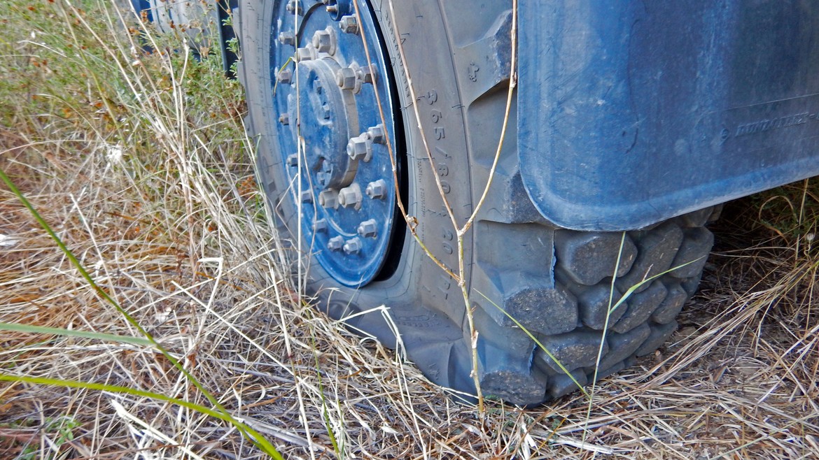 Une désagréable surprise nous attend en ce matin du 11 juin. Antares a été vandalisé. Rien de bien méchant mais quand même… Un pneu, que nous pensons d’abord crevé, n’est heureusement que dégonflé mais il y a aussi et hélas un trou de la taille du poing dans la cellule sous le porte-moto. A côté du camion on retrouve ce que l’on suspecte fortement être l’arme du crime : un gros caillou pointu… On discute avec les gens du village qui ont l’air de suspecter les vandales. Mais nous n’en sauront pas plus. Une nouvelle réparation attend notre Mike-gyver !