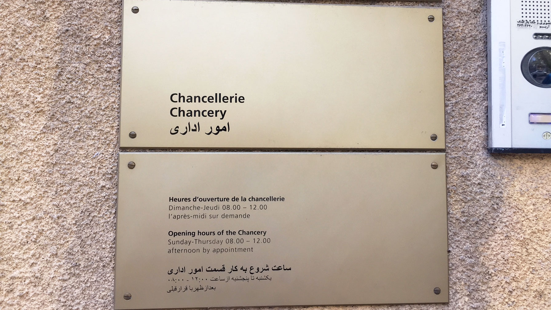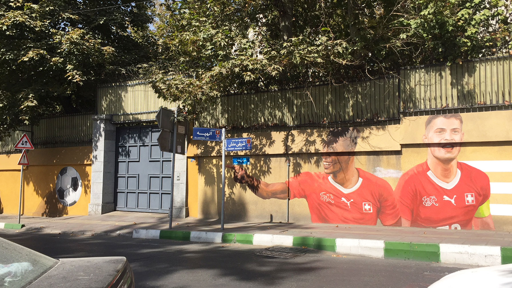 L’ambassade de Suisse à Téhéran est la plus grande en taille qu'il nous ait été donné de visiter jusqu'à présent. Deux joueurs aux couleurs de la Nati sont peints sur les murs qui l’entourent et le portail pour les véhicules présente la croix suisse : un clin d’œil sympathique à notre nation. Il y a une porte d’accès pour la section des visas et une autre pour la chancellerie (horaires dimanche à jeudi 8h00-12h00). C’est cette deuxième entrée que nous empruntons. Après quelques mots d’explication sur notre visite à la secrétaire, nous sommes reçus par le Chargé d'Affaires. Comme nous nous y attendions, il est en mesure de nous fournir la lettre d'invitation adressée à l'ambassade de l'Inde mais non celle adressée à l'ambassade du Pakistan, en accord avec les recommandations du DFAE, et ce malgré toute la bonne volonté du monde. Nous repasserons chercher et payer le document (4’000’000 rials) car nous n’avons pas suffisamment d’argent sur nous.